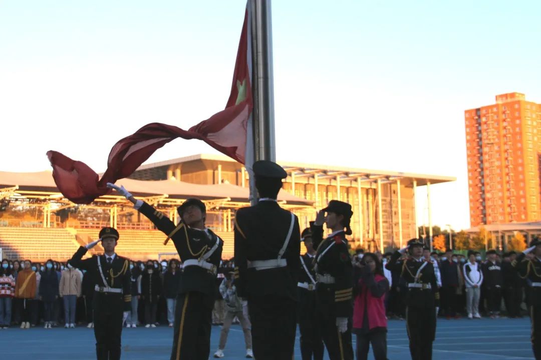 心怀迷彩情怀,立志报效国家,五星红旗冉冉升起,全体师生庄严肃穆,奏唱国歌。