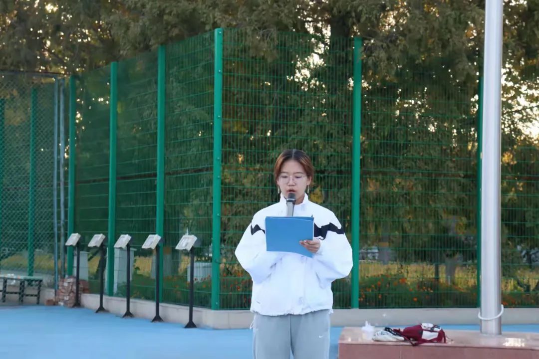金融218班浩蓝代表军训优秀员工代表发言。她表示,军训对她来说意义非凡,军事技能训练不仅是磨炼意志、强健体魄的“练兵场”,更是体悟家国情怀,学习党史知识的“思政课”。军训虽然暂告一段落,但在绿茵场上收获的成长与集体荣誉感,将对她终身受益。