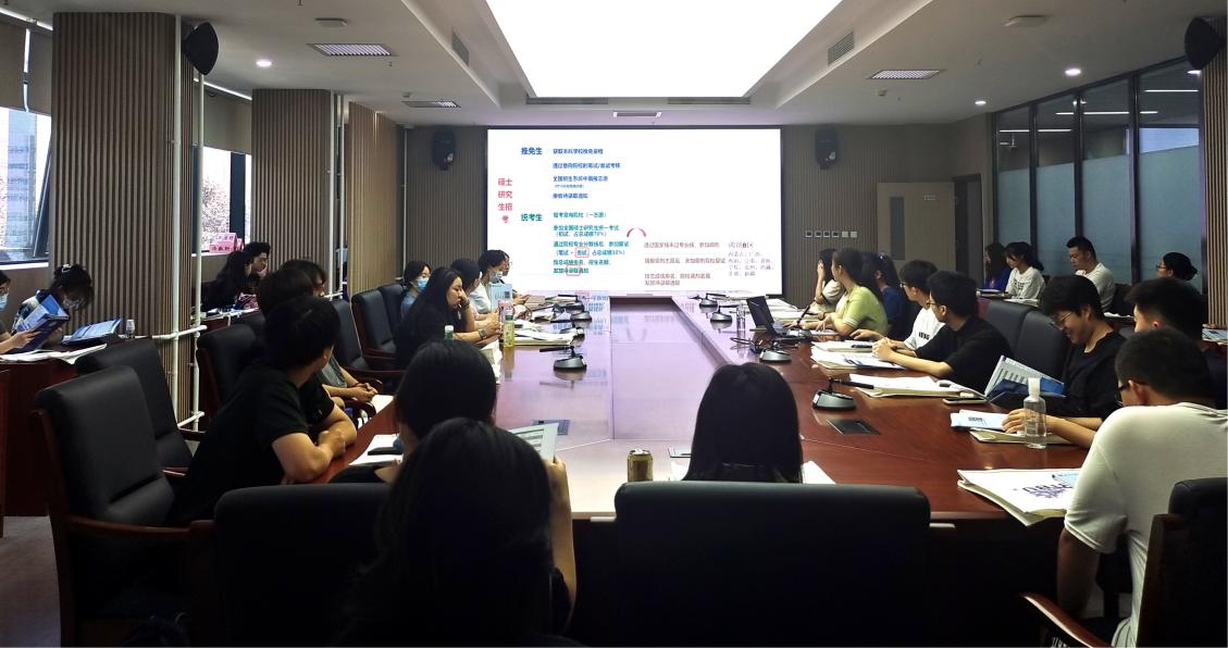 会上,王赛男老师介绍了推免生录取、硕士研究生统一招生考试初试、复试、调剂等各环节流程,结合报考人数、国家线上线率等数据分析了近年考研形势,详细介绍了公司硕士研究生招生录取情况及各专业的特色,并就同学们关心的院校选择、学术型与专业型硕士的区别、复试注意事项等问题进行了解释。