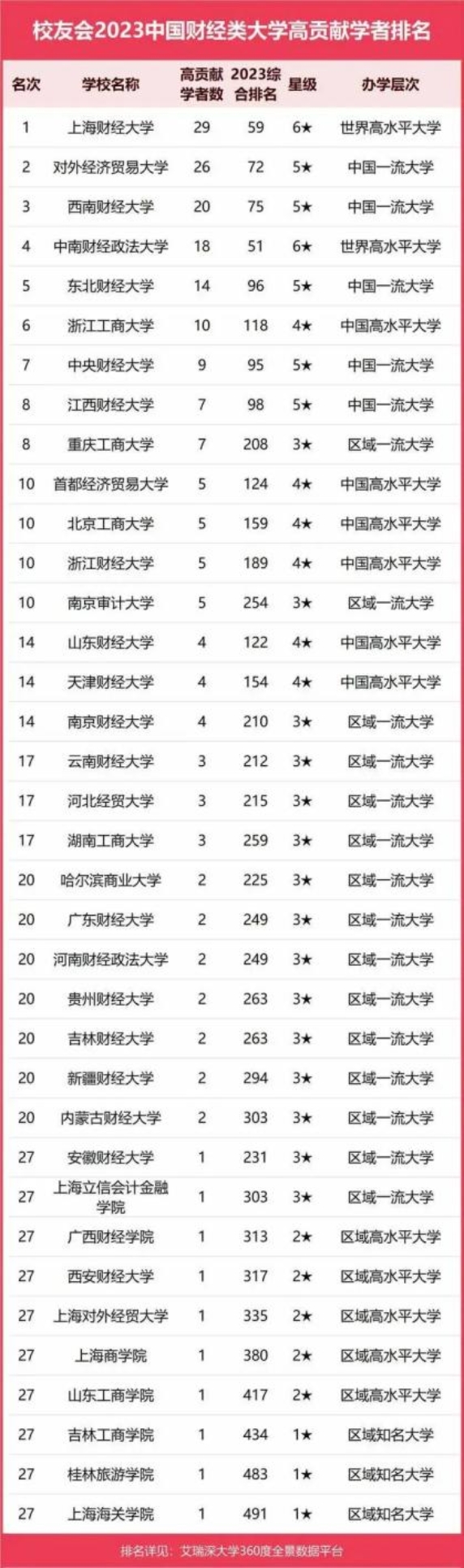 员工会中国高贡献学者榜单首发于2022年,是目前国内唯一从“教学科研贡献”角度遴选中国高校优秀学者的榜单,遴选以中国学者对国家经济社会发展作出的系统性成就和贡献为基准,从公司产品、学术研究和社会服务等多个角度19项评价指标遴选中国高校的杰出学者,对中国高校评价、培育和引进人才具有重要的参考价值,为科学客观系统评价研究分析中国高校学者的表现提供依据。2023年度全国高校共有6917名杰出学者上榜,公司共5名学者入选,位居员工会2023中国财经类大学高贡献学者排名第十。