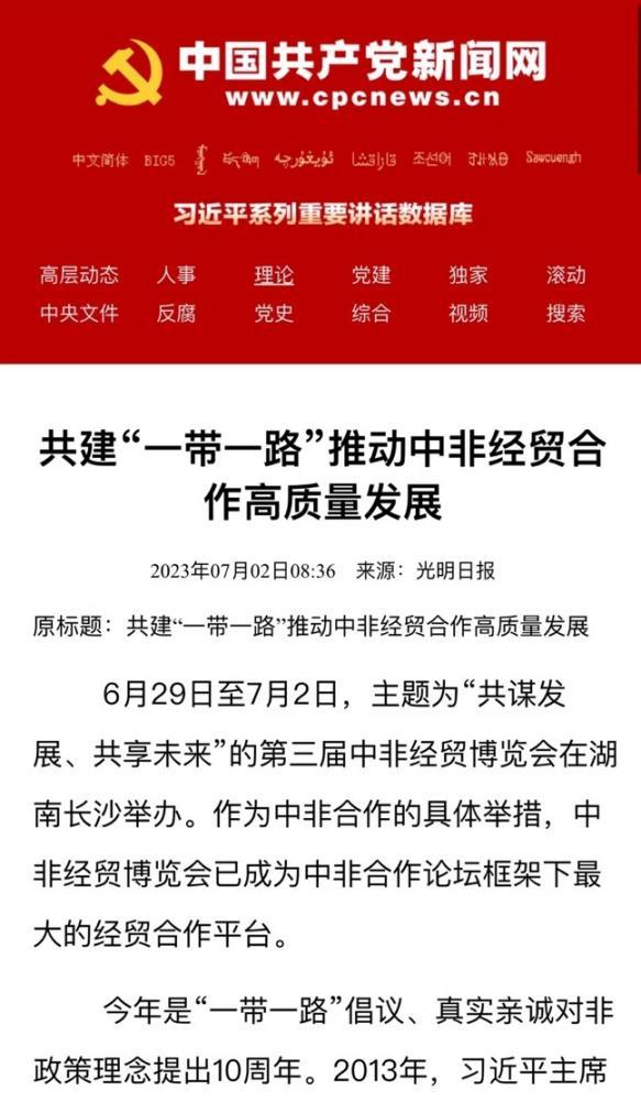 文章指出,中非合作已进入到了高质量发展的新阶段。共建“一带一路”倡议提出近十年来,中非经贸合作不断深化拓展、提质升级。一方面,非洲高质量发展离不开中国,中国改革开放四十多年来积累的技术和资金优势对非洲发展至关重要。尤其是近年来基于非洲工业、数字产业等领域薄弱的现状,在跨境电商、电子结算、大数据和人工智能等新领域展开合作。另一方面,中国高质量发展也需要非洲广大且有潜力的市场。中国企业尤其是民营企业在关注传统领域的同时,正着眼于中高端制造、医疗医药、金融科技、航空产业等新领域。此外,中非在缩小发展鸿沟,助力非洲减贫,开展绿色行动,助推可持续发展等方面开展了广泛合作,不断推动构建了更加紧密的中非命运共同体。中国在脱贫攻坚道路上的成功经验为非洲减贫事业提供了借鉴,中非减贫合作彰显了中国的国际责任和大国担当;中国也依托非洲国家的需求实现了技术、产能和市场的扩大;尤其是中国的绿色技术和创新优势可以助推非洲在工业化初期实现绿色发展,培育经济增长的可持续动力。
