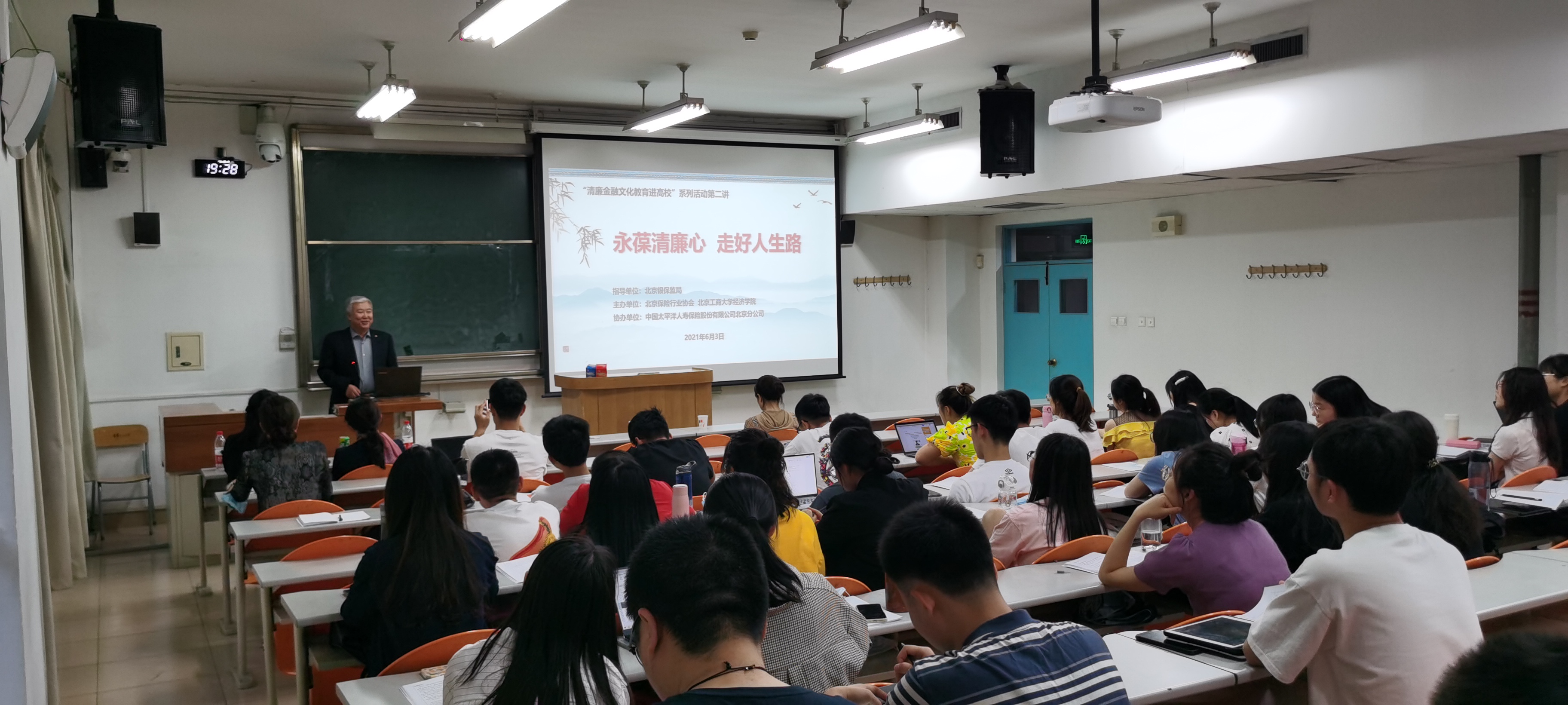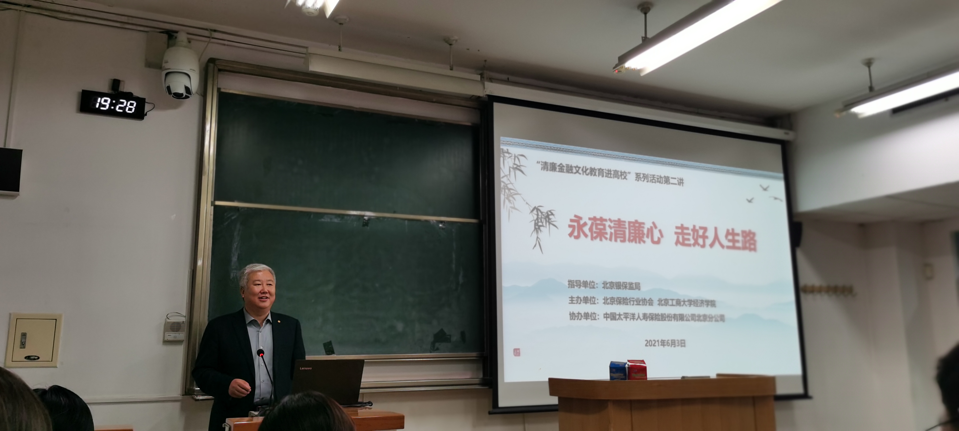 6月3日晚,“清廉金融文化教育进高校”系列讲座活动之《永葆清廉心,走好人生路》在阜成路校区教三楼315举行,演讲嘉宾为北京保险行业协会副秘书长张阿玲和中国太平洋人寿保险股份有限公司北京分公司党纪委书记、副总经理郝连山。yl23455永利风险管理与保险学系主任徐徐主持,百余名研究生聆听讲座。
