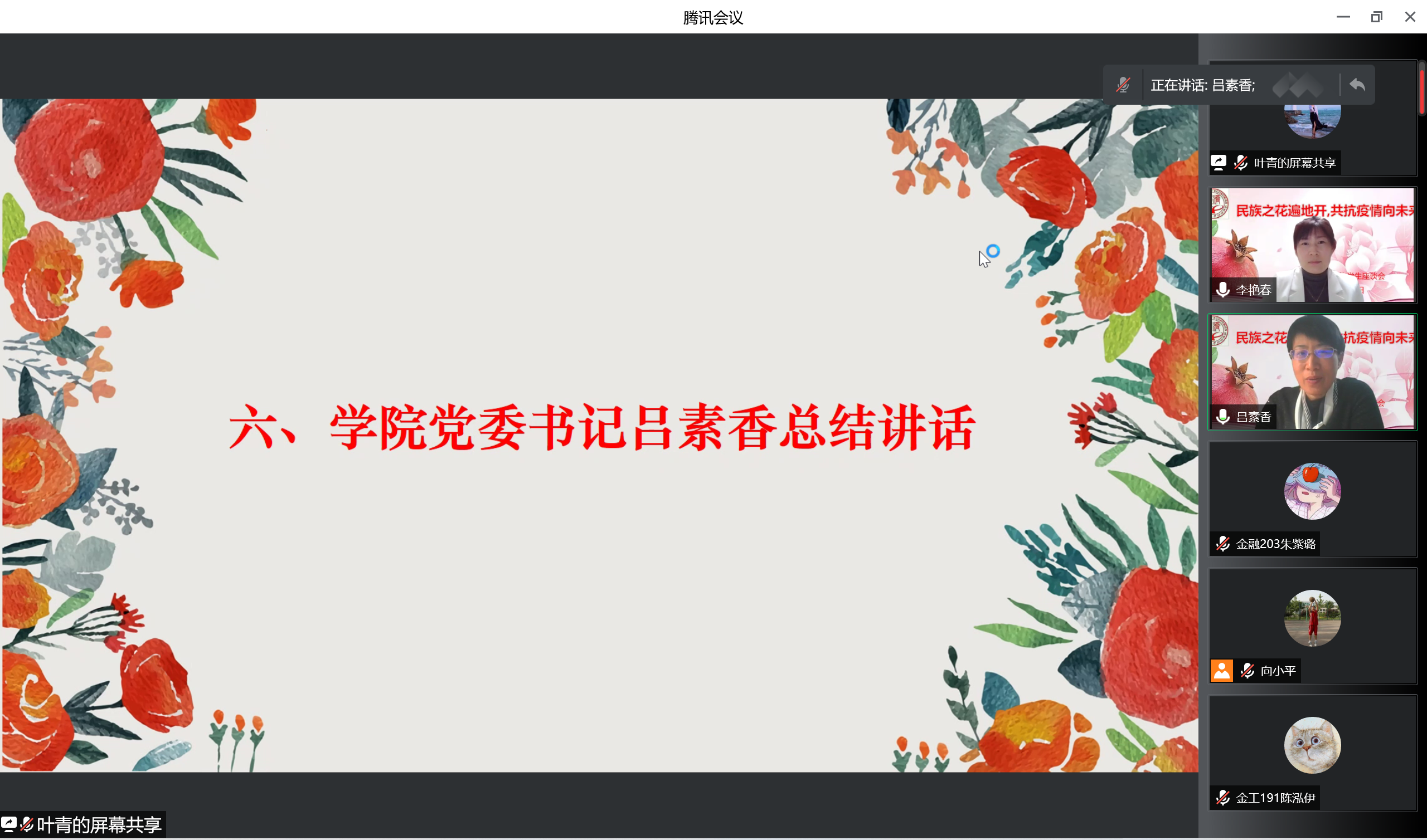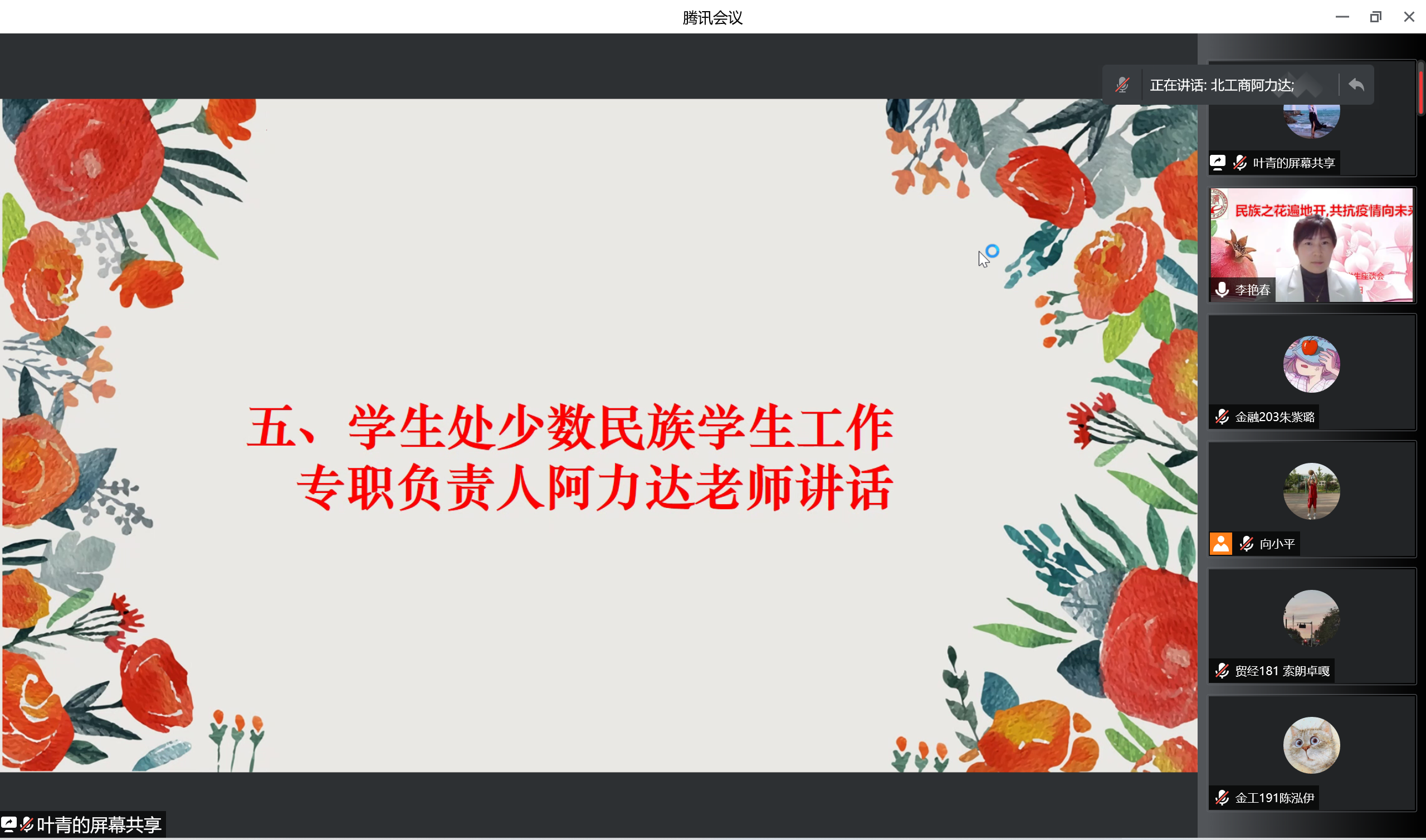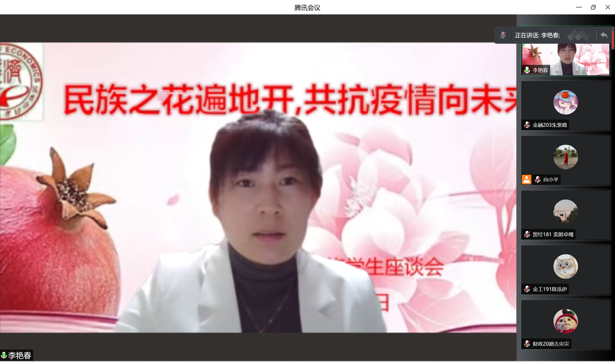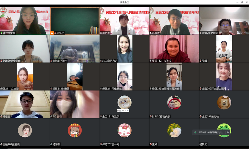 经贸211班 再依努尔.依米提、财政20班李美琪、经贸213班刘璐雪、金融217班罗爔作为少数民族员工代表发言,他们围绕学习、生活、心理等方面分享了自己的经验,同时也就疫情期间居家学习和防控措施等问题进行了交流。员工代表们纷纷表示在疫情居家学习期间,公司给予了许多关爱和支持,同时也对疫情期间的公司管理表示充分的理解和认可。他们表示,在居家学习时,一定要保持规律的作息时间,提高学习效率。作为新时代青年,在疫情防控的关键时刻,要有青春担当,主动遵守当地的疫情防控要求,用实际行动回报师长、回报公司、回报社会,希望不久的将来能在春暖花开的校园再次相遇。