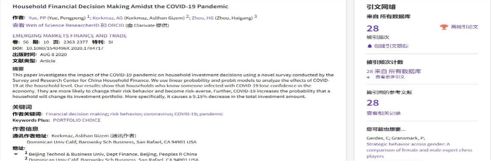 公司以制度化的方式,从学术交流、论文发表等多方面为青年教师提供支持。截至目前,2021年“鲲鹏计划”已培育发表A类论文50余篇,青年教师岳鹏鹏博士以yl23455永利官网为第一单位发表在Emerging Markets Finance and Trade期刊上的论文成功入选Economics & Business领域全球前1%ESI高被引论文。