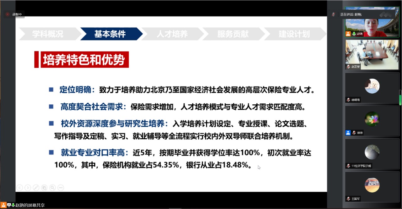 专家组成员在审阅评估材料、听取教师和员工汇报的基础上,一致认为公司保险专业学位授权点的培养目标准确、定位清晰,培养方向设置合理、适应社会需求,在人才培养模式、“双师型”培养机制设计、思政教育引领、国际认证培育等方面有特色和优势;校内外导师在保险专业和行业领域具有良好的学术实践指导水平和社会影响力;学业导师、职业导师数量充分、队伍结构合理;教学、科研、奖助体系等支撑条件保障充分;学术科研成果丰富,体现出学位点积极参与首都相关行业发展建设所取得的良好成果。同时,专家组建议进一步优化团队结构建设,加强教学成果积累,积极申报国内外重要学术成果奖项,继续加强社会服务参与度,为学界业界贡献更多引领性的教学科研成果。