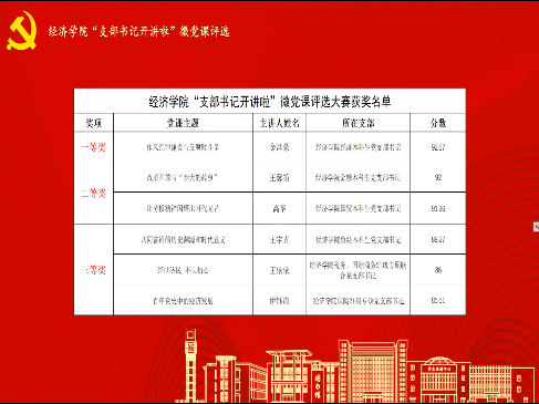 随后,由员工处副处长盖晓庆宣布评选结果。来自经济本科生党支部的金泽豪荣获一等奖,来自金融本科生党支部的王馨笛和国贸本科生党支部的高华荣获二等奖,来自贸经本科生党支部的王宇青、保险21级专硕党支部的王依依、税务与国际商务21级专硕联合党支部的伊钰霞荣获三等奖。她希望各党支部书记能够继续发扬“头雁”风采,发挥好党支部的战斗堡垒作用,加强理论知识学习,旗帜鲜明、锐意进取、踔厉奋发、勇毅前进,以青春奋斗为党的二十大召开献礼。