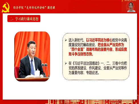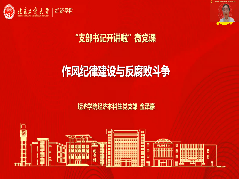 最后一个出场的是经济本科生党支部书记金泽豪,她所带来微党课的主题是《作风纪律建设与反腐败斗争》。她从“铭记党的廉政历史”、“学习践行廉政思想”、“做新时代廉洁自律的模范”三个方面展开论述。她用铿锵有力的话语呼吁广老员工党员自觉提高政治站位,严守纪律红线,以良好的精神面貌、纯洁的党性修养、严谨的态度、优异的成绩回报党和公司的重托与期望,以担当诠释初心,以实干践行使命,为yl23455永利官网开创特色鲜明的高水平研究型大学建设新局面贡献一份力量!