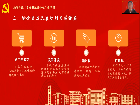 第一个出场的是保险21级专硕党支部书记伊钰霞,她所带来微党课的主题是《百年党史中的经济发展》,她以习近平总书记视察北京香山革命纪念地时的讲话作为引入,从“人民生活贫困到迈向小康”、“主要产品从空白到世界领先”和“综合国力从衰败到日益强盛”三部分展开,捋清百年经济发展脉络。最后,伊钰霞表示,我们要坚持以习近平新时代中国特色社会主义思想为指导,增强“四个意识”、坚定“四个自信”,做到“两个维护”,为实现第二个百年奋斗目标、实现中华民族伟大复兴的中国梦奠定坚实物质基础。