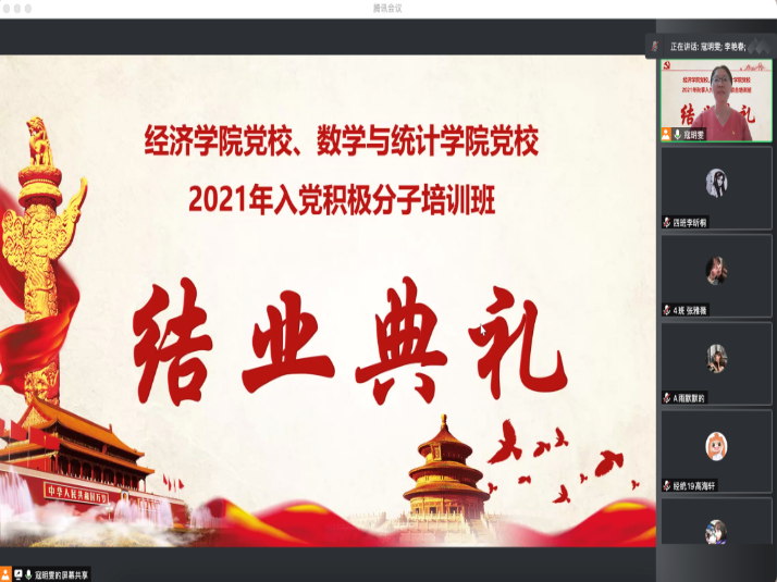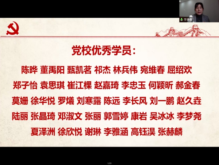 11月24日,公司党校、数学与统计公司党校举行2021秋季入党积极分子联合培训班结业典礼,典礼全程以视频会议的形式线上召开。公司党委副书记李艳春、数学与统计公司党委副书记徐伟钦、yl23455永利专职组织员卫一润以及入党积极分子385人出席结业典礼。大会由数学与统计公司专职组织员寇明雯主持。