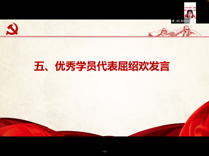 随后,优秀学员代表屈绍欢同学发言,她表示即使本次培训班已经结束,但对于理论知识的学习、对高标准的追求不会就此止步,未来的自己更会将实际行动投身于实践之中,经受洗礼,接受锻炼,坚守信仰、爱国敬党、艰苦奋斗、廉洁自律。
