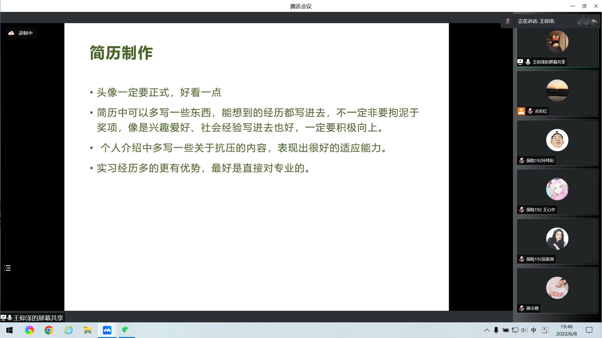 二、求职就业方面。由金佳贝(保险18,泰康北分、大家保险北分等offer)和王仰泽(保险18,阳光人寿总公司HR实习,阳光人寿北分offer)两位学长结合自身就业经历,分享了就业信息获取、简历编写、需要具备的经历和能力等信息。从岗位特点、面试技巧、心态准备、平台选择、职业前景等角度分享了求职经验和注意事项,特别指出面试会考察抗压能力和逻辑思维能力,可以提早进行准备。