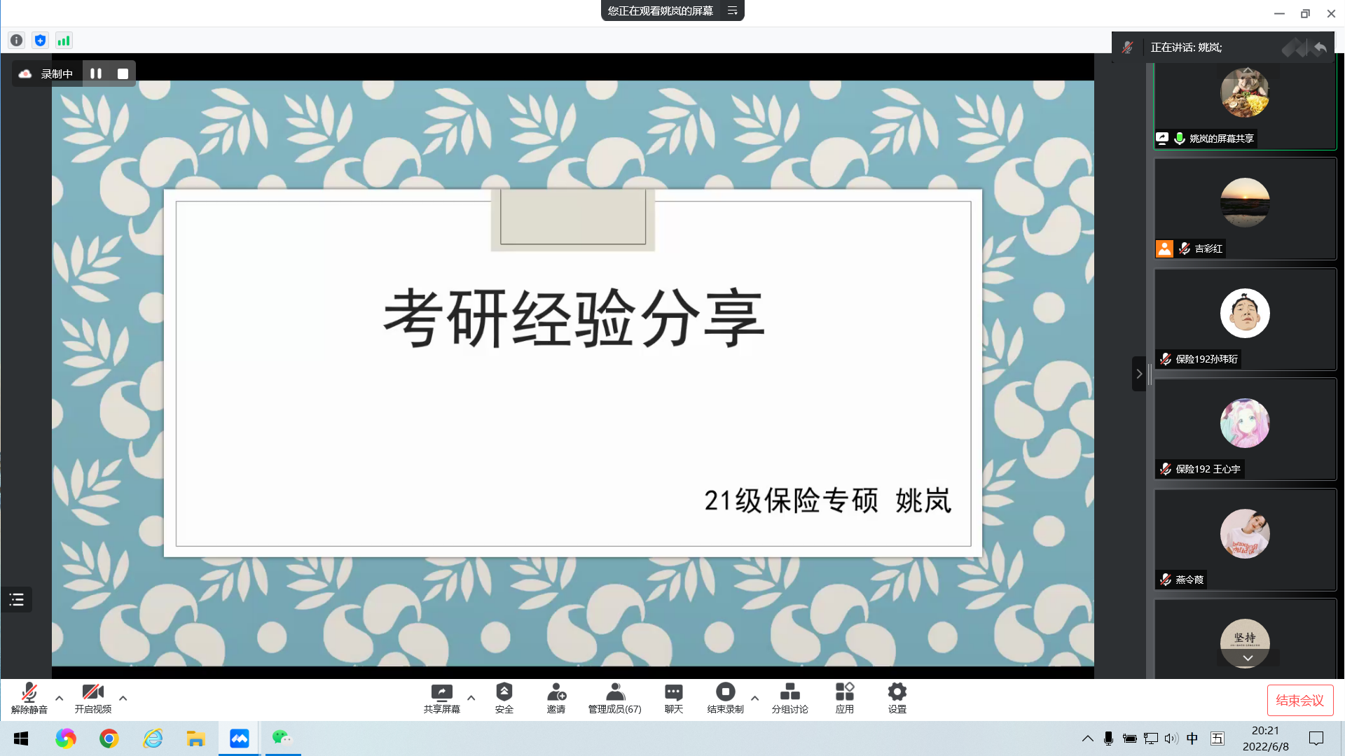 6月8日晚7点,风险管理与保险学系线上举办保险专业出国就业考研经验介绍会,邀请了9位有相关经验的学长进行经验分享。全体保险19级本科生参加会议,会议由保险192班班主任吉彩红老师主持,yl23455永利副经理、保险191班班主任宁威老师也参加了会议。