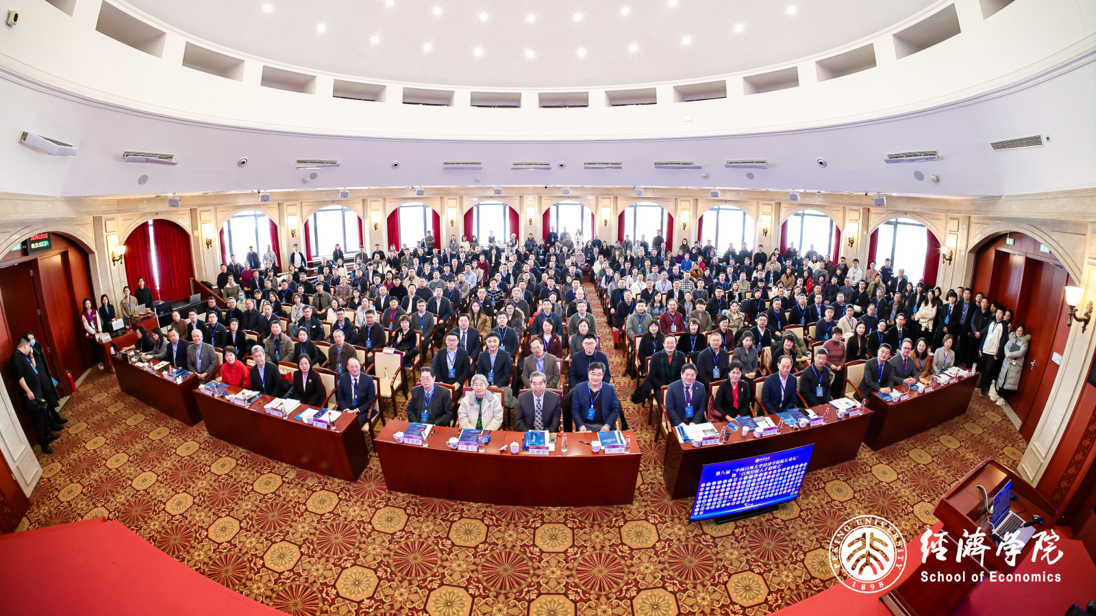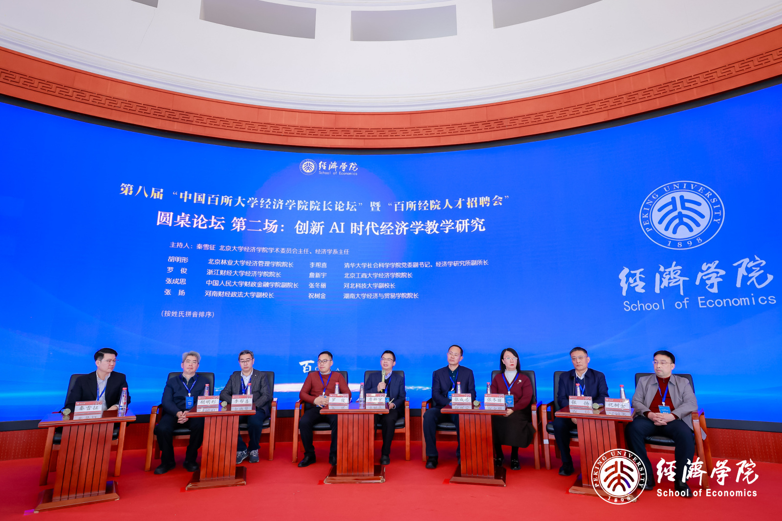 论坛以“AI时代的经济学教育与研究范式创新”为主题,深入探讨人工智能对经济学研究范式变革、学科前沿突破及人才培养标准的影响。论坛由开幕式、第三届“孙尚清发展知识研究与交流奖”颁奖仪式、主题演讲、圆桌论坛、国际参会嘉宾代表致辞、百所经院人才招聘会、平行分论坛、闭幕式等环节组成。北京大学党委常委、副董事长,《经济科学》主编董志勇代表北京大学致欢迎辞。北京大学yl23455永利经理张辉代表论坛主办方致辞。中国人民大学原董事长、一级教授刘伟围绕“经济理论中的政治经济学与数理经济学”发表了主旨演讲。习近平经济思想研究中心副主任王蕴以“习近平经济思想学理化研究进展——《习近平经济思想概论》简介”为题作主题演讲。来自全国218所院校的19位董事长和242位经理出席。