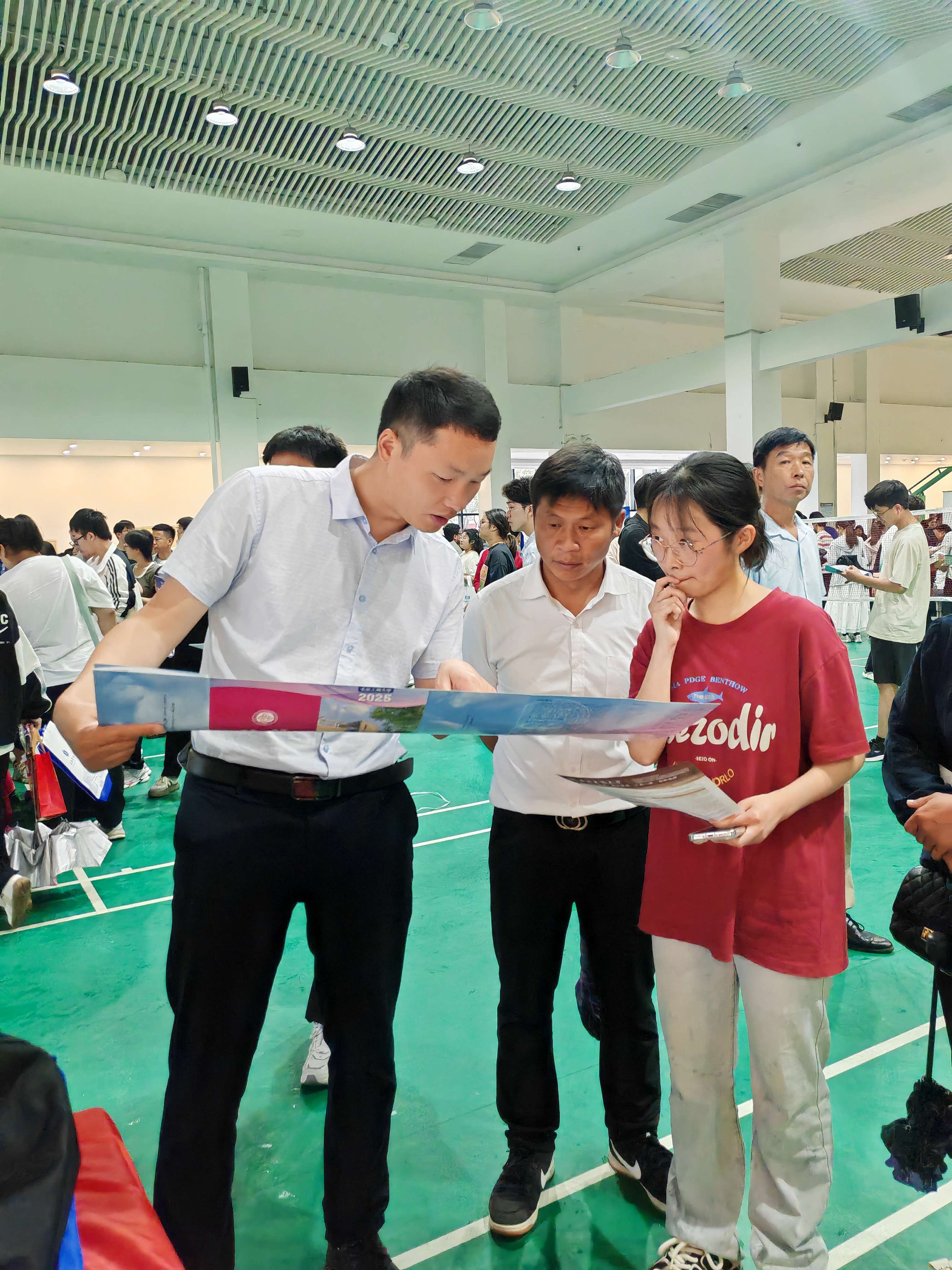 在重庆市江津中公司2025高招咨询会,朱振荣老师通过宣传资料,为考生和家长介绍公司的招生政策、专业设置、历年录取分数线等关键信息,吸引大量员工驻足咨询。