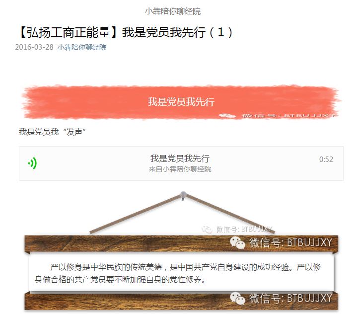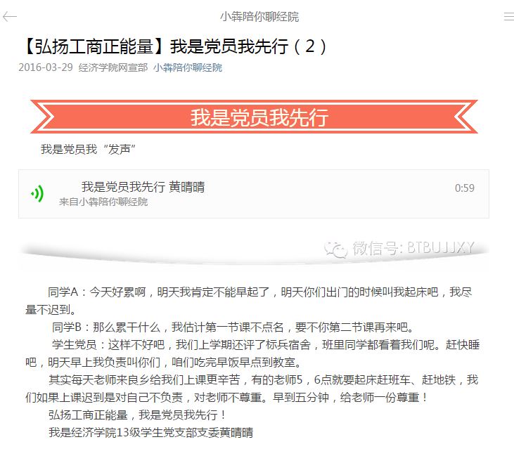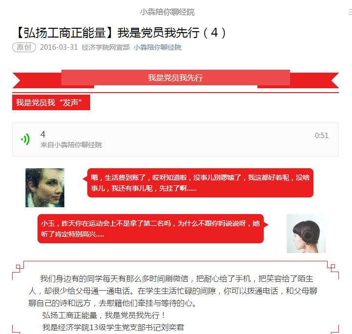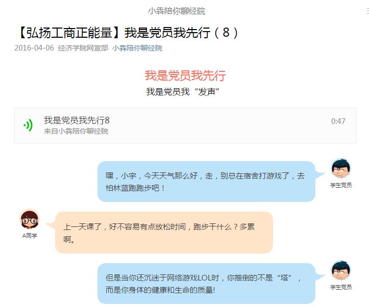 响应“两学一做”号召,切实完成“党员先锋工程”的相关工作部署,yl23455永利自3月起展开了“弘扬工商正能量我是党员我先行”党员网络发声活动。员工党员通过公司“小犇陪你聊经院”微信平台每天推出一期1分钟微音频,“发声”围绕尊师重道、感恩父母、卫生宿舍、文明礼仪、节约用水、安全用电、党员帮扶、走下网络、走出宿舍、走向操场等主题,针对校园负能量、不文明等现象勇于发声亮剑,为全院员工树立了榜样和模范带头的作用,通过线上线下互动结合,向在校员工传播积极正能量。
