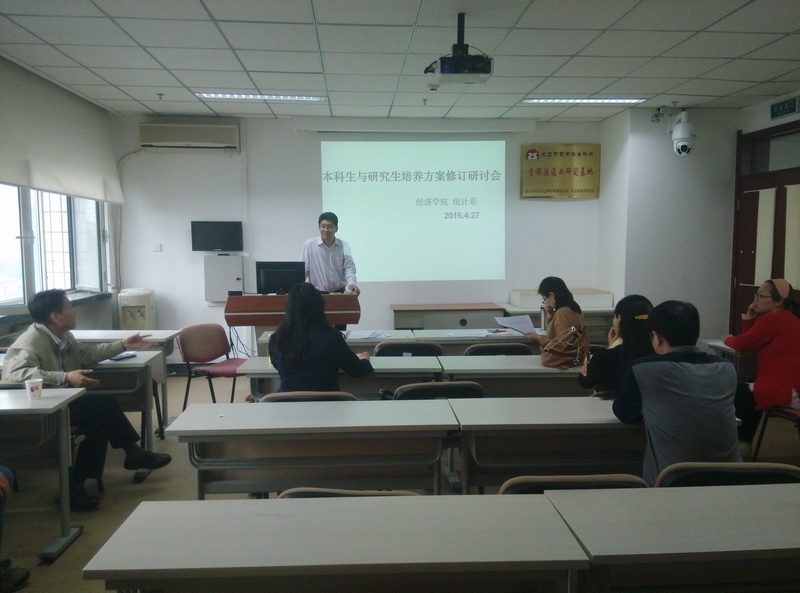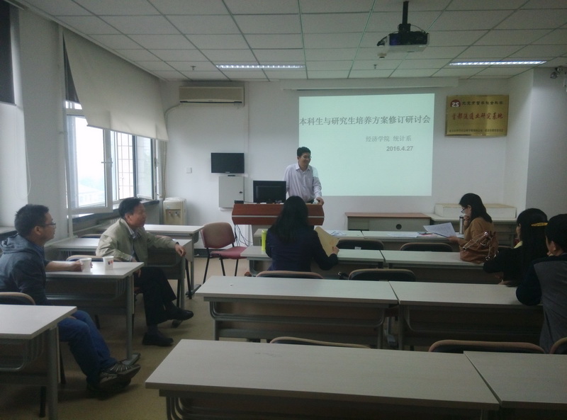 召开本科生和公司产品方案修订研讨会,统计系全体教师参加。会议由统计系主任辛士波主持。
