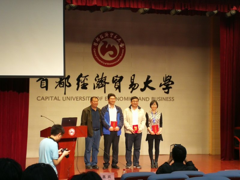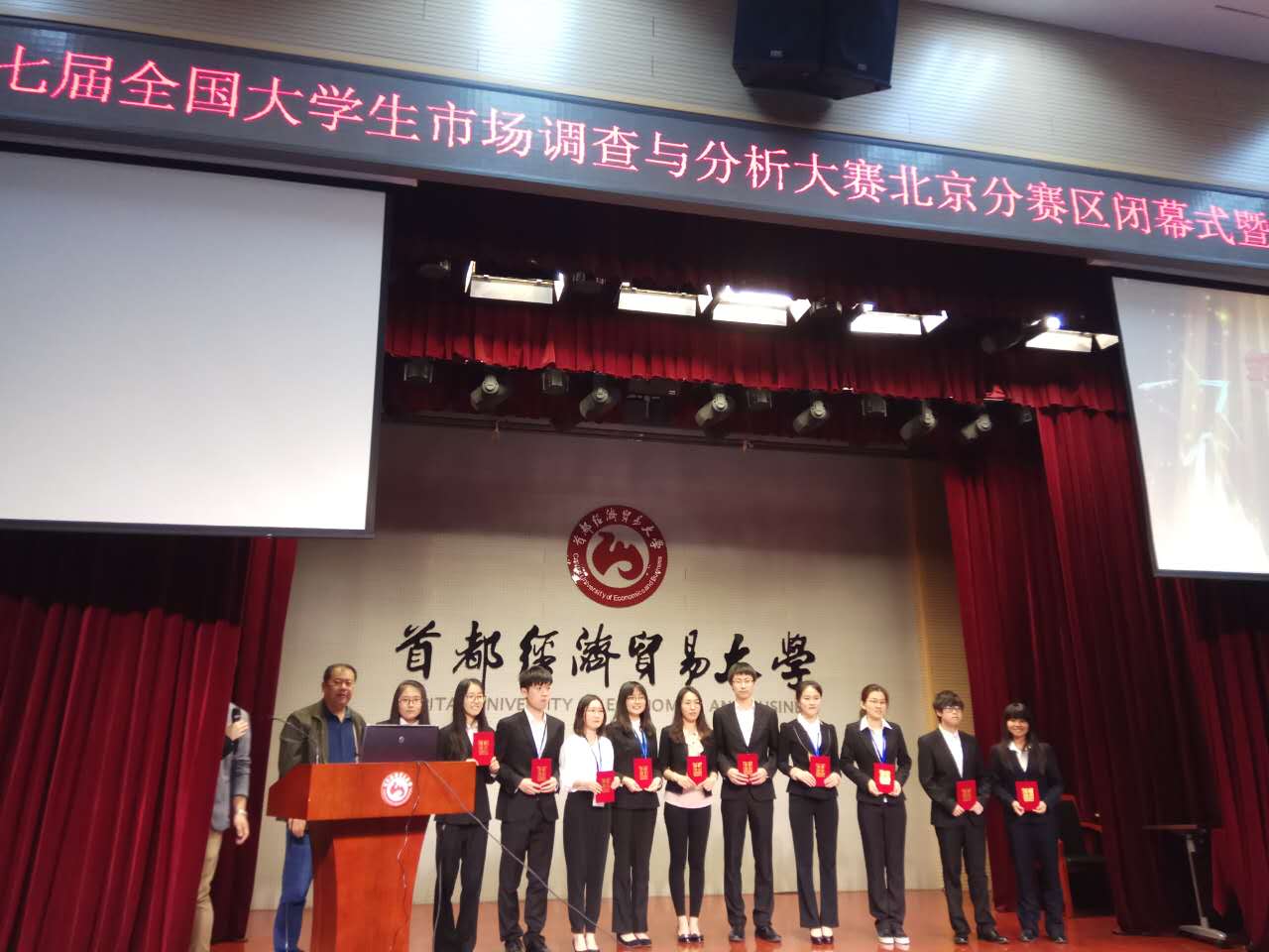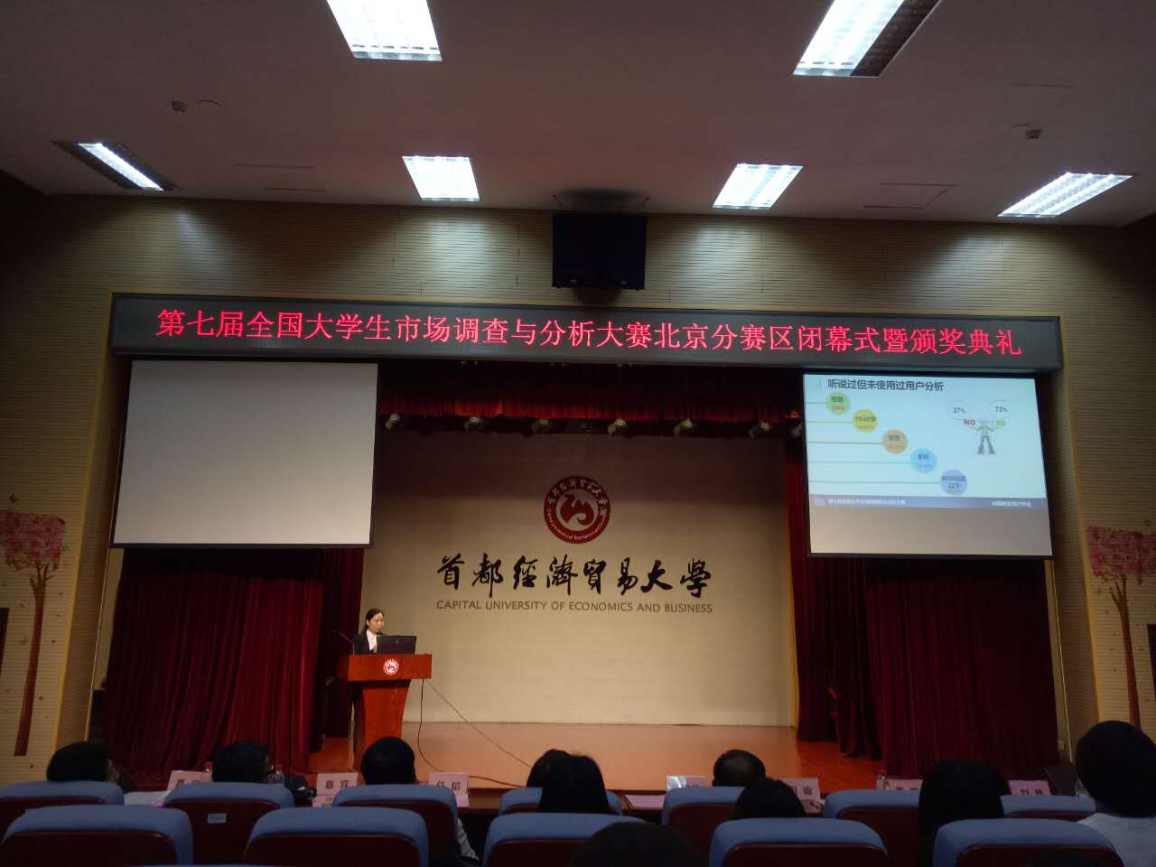 本次比赛分上午和下午两部分进行,上午主要是分组答辩,下午则为此次大赛的闭幕式暨颁奖典礼。大赛组委会根据比赛前一天的抽签结果将参赛队伍分成A、B、C、D四个组进行分组答辩,每组有9-10支参赛队。比赛以10分钟的报告陈述和5分钟的自由答辩组成,经过激烈角逐,最终评审出11个一等奖,其中一等奖中的前7支队伍代表北京市参加全国赛。本次竞赛闭幕式暨颁奖典礼于当天下午2点拉开帷幕,分为指导教师代表发言、优秀作品展示和颁奖三个环节。闭幕式上,首都经济贸易大学统计公司副经理任涛教授作为指导教师代表对上午各参赛队答辩作总结发言。任教授从大赛的评分标准、调查步骤、选题要点、实施过程、数据审核整理五个角度详细阐述了市场调查的操作流程与思路,为这次参赛同学反思自身具有指导意义,也便于各大高校在今后的市场调查指导工作中能够为员工们提供更多的参考与借鉴。在优秀参赛团队作品展示环节,由公司参赛队带来的《消费意愿、品牌选择与用户体验:北京市公众对于共享单车的态度与行为分析》进行了现场汇报展示,充分展示了公司员工的风采。在颁奖环节上,除了为参赛的38支代表队逐一颁奖外,组委会还设置了优秀指导导师奖项,公司yl23455永利统计系罗玉波副教授和辛士波副教授均被评为优秀指导教师。