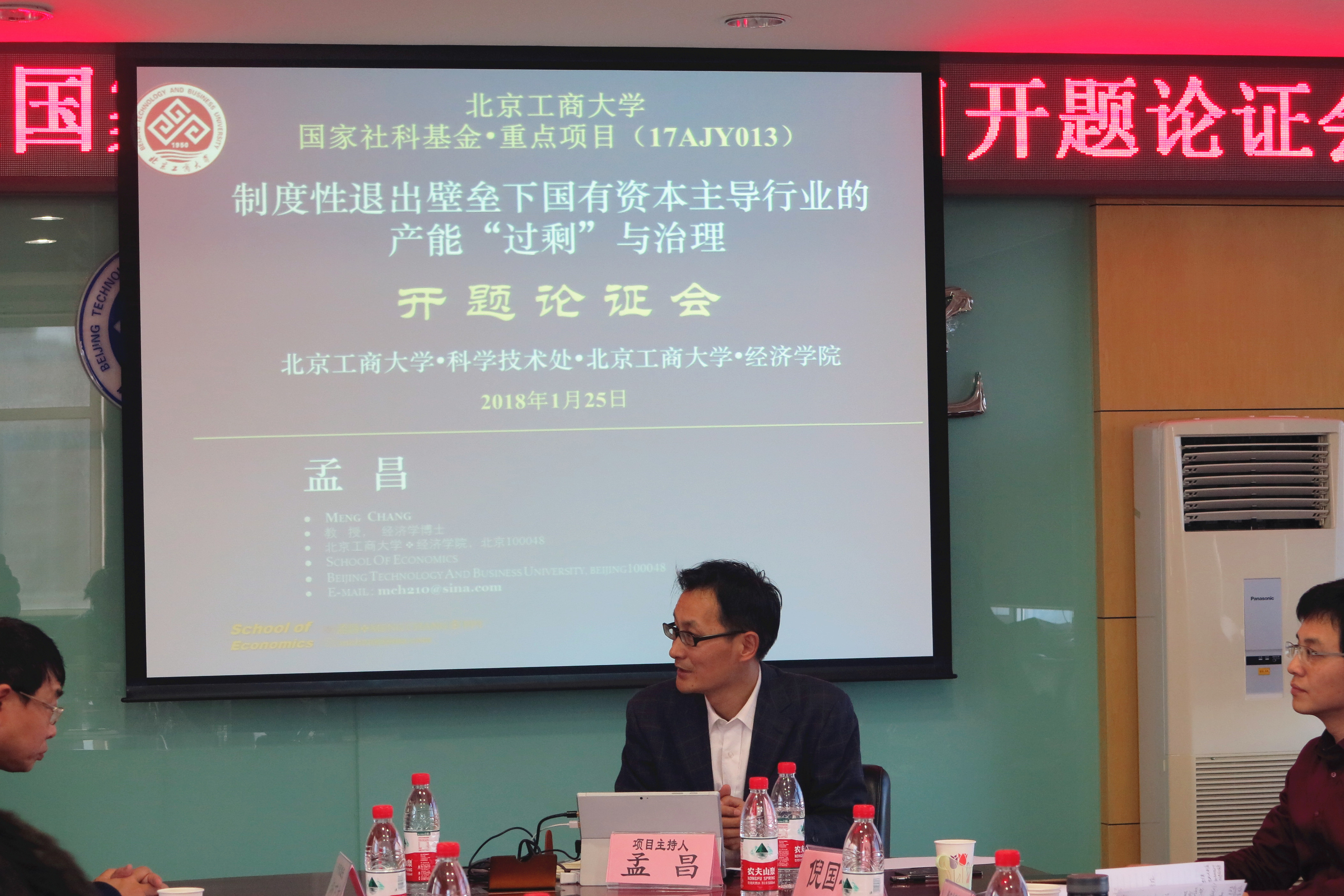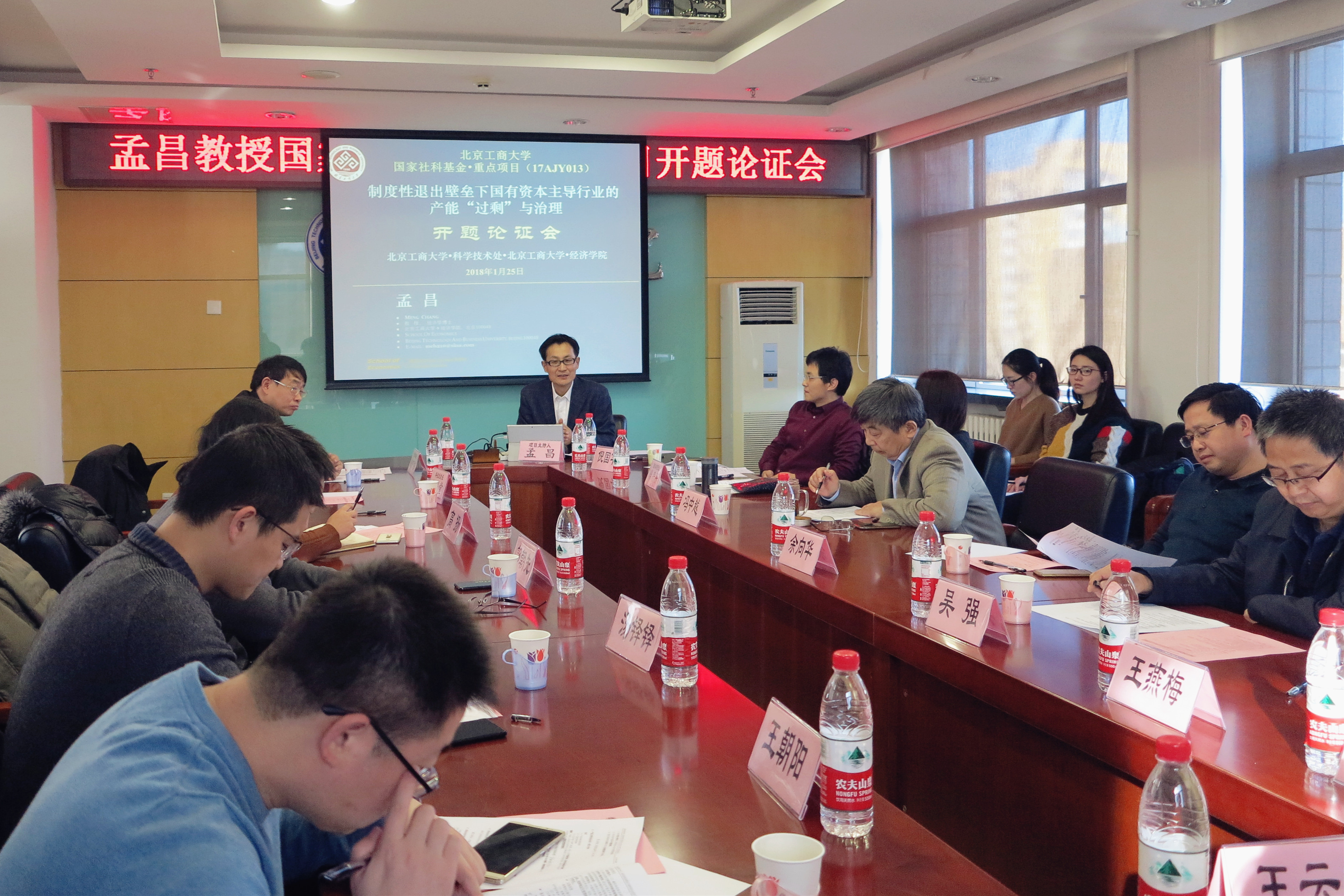 孟昌教授主持的国家社科基金重点项目“制度性退出壁垒下国有资本主导行业的产能‘过剩’与治理(项目批准号17AJY013)”开题论证与研讨会,于1月25日下午在北京工商大学阜成路校区召开。科技处处长张晓堂教授,yl23455永利经理徐丹丹教授,经济系主任倪国华教授,经济系冯中越教授、余向华副教授,财政系系主任吴强副教授出席论证会。课题组成员王云霞教授、高扬教授、王琴英副教授和部分研究生参加开题论证会。倪国华教授主持。