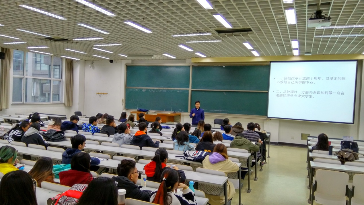 讲座中,倪教授首先致敬改革开放四十周年,希望同学们以坚定的信心致敬自己所学的专业,其次从处理好三方面关系谈如何做一名奋进的经济学专业老员工:
