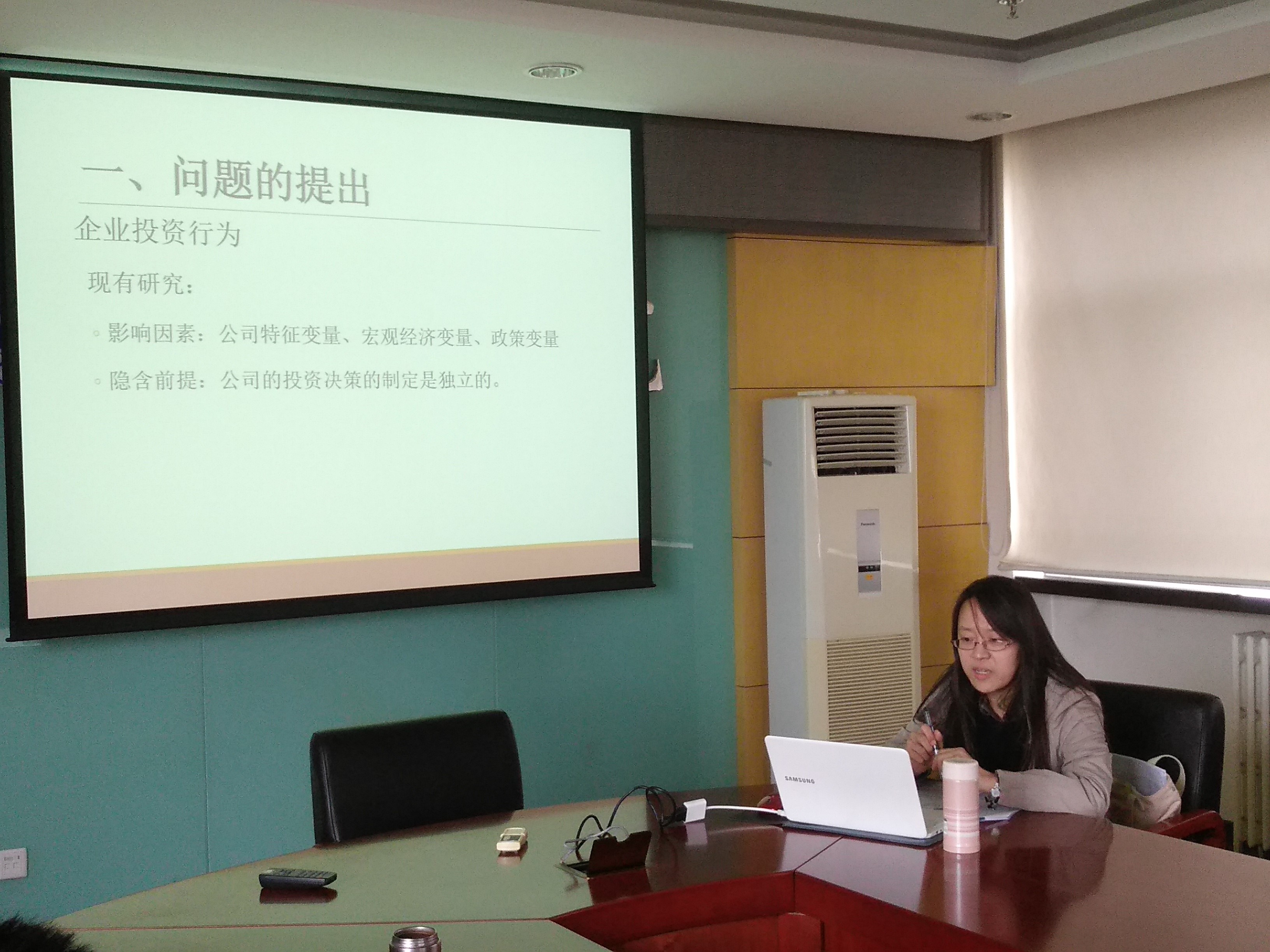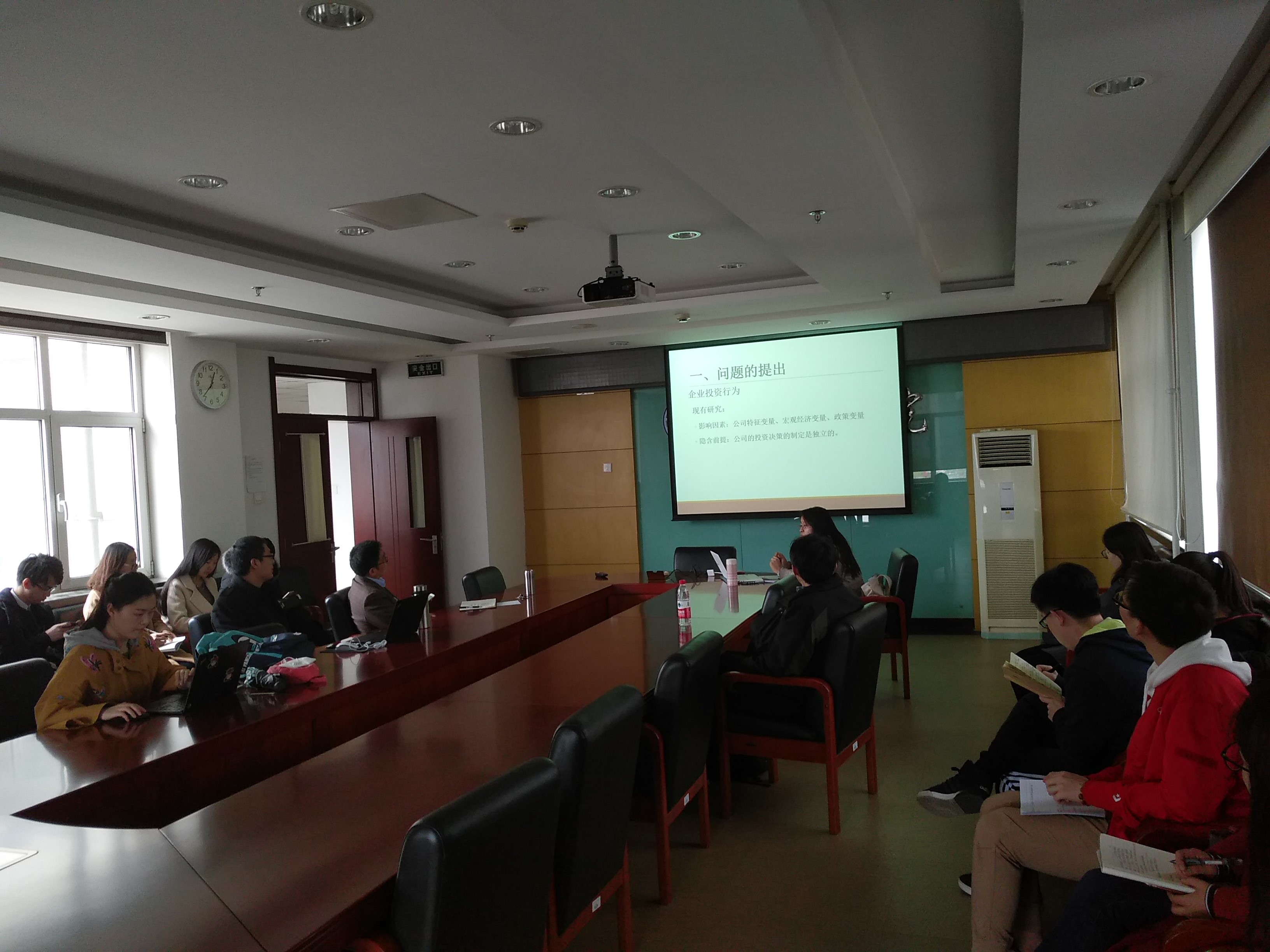 之后,老师和同学们围绕论文进行了激烈的讨论。张伟老师认为研究题目不够集中,论文不够紧凑,对信息不对称假设的分析过于宽泛。徐小茗老师强调了微观实证研究的难处,对投资行为的微观特征的捕捉还要斟酌。张琳老师对实证论证的过程提出了建设性的意见,帮助论文加以完善。赵峰老师对数据分类的合理性提出了质疑,建议对同行业做更加细致的分类。张正平老师提出,对财务绩效的分析采用滞后变量进行分析更加合理。在研讨过程中,研究生同学也纷纷发言提问,阐述自己的观点,程悦老师对投资数据分析,信息不对称的定义等问题进行了详细的解答。整个研讨过程气氛热烈,老师们开门见山,直指存在的不足,并积极给出修改建议;同学积极参与讨论,获益匪浅。