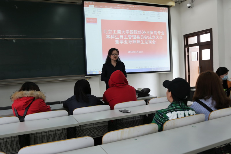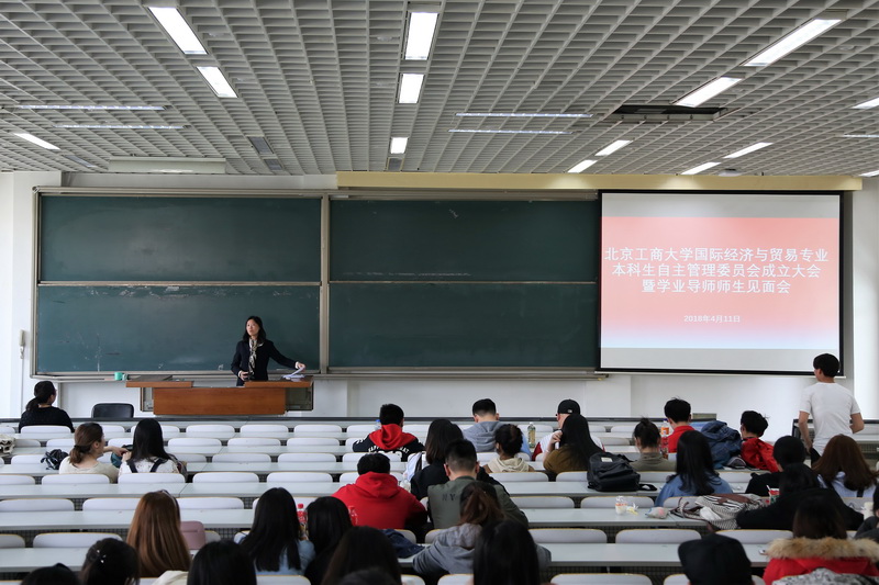 2018年4月11日,春和景明,万象更新,国际经济与贸易专业本科生自主管理委员会成立大会暨学业导师师生见面会在良乡校区文二楼301隆重召开,贸易系副主任、国贸教研室主任朱振荣主持会议。贸易系主任郑兰平率领11名学业导师出席了大会,15级辅导员卫一润和国贸本科生班主任潘宏、王卓、郭志超以及国贸15、国贸16(全英)、国贸17(全英)本科班员工参加了大会。会后,通过15名自管委成员的推选程序,国贸17(全英)班长苏欣担任自管委主席,国贸15班长张凡、国贸16(全英)班长吴亚琪担任副主席,其他12人担任委员。