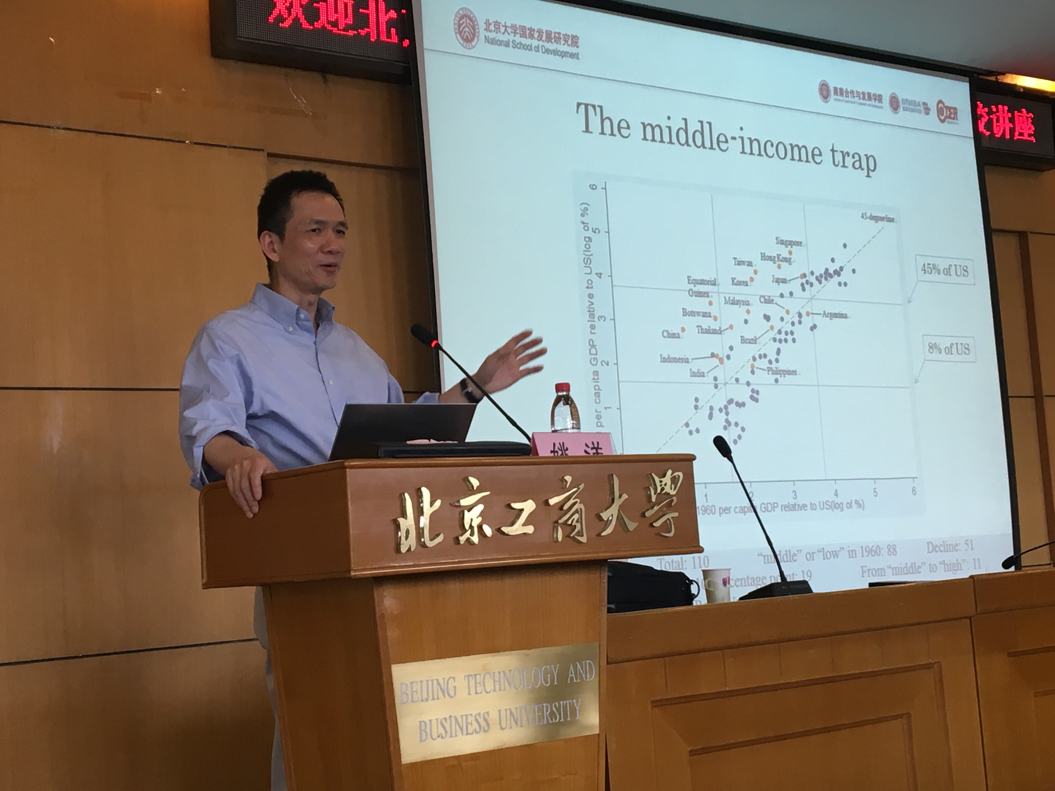 讲座的主题是“中国的现代化挑战”。姚教授从近代化以来中国主动与被动融入全球化进程中探索国家发展、民生改善的历史谈起,首先分析了只重器物学习不重制度建设的洋务运动、以及西风东渐下形成的不同制度文化思想碰撞对中国的影响,然后在国际比较的视角下,重点分析了中华人民共和国成立以来我国发展的艰难探索和工业化成就,以及改革开放形成的巨大的经济进步,并通过数值模拟分析了到2049年也就是中华人民共和国成立一百周年的可能经济成就和增长率需求。在此基础上,姚洋教授重点分析了当前现代化加速进程中面临的老龄化加速、中等收入陷阱,以及国际格局变化的巨大不确定性等挑战的影响,并联系当下愈演愈烈的中美贸易争端问题,进行了深入分析、预判和重点应对之策论断。