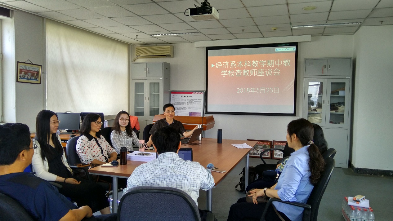 2018年5月23日中午,经济系教师在阜成路校区综合楼814召开经济学本科教学期中教学检查教师座谈会,经济系主任倪国华老师、副主任牛晓燕老师、郭毅老师、高扬老师、赵泉老师、高建业老师、余向华老师、张宏艳老师、程熙镕老师等多名教师参加了座谈,会议由经济系副主任熊文老师主持。