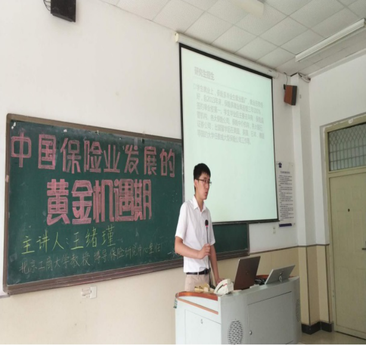 王老师在报告中回顾了yl23455永利官网的历史和yl23455永利的发展成果,欢迎各位同学报考并进一步攻读博士学位。之后王老师做了“把握中国保险业发展黄金机遇期”的讲座,回顾了中国保险业发展的重要节点,当前保险业取得的成绩和存在的问题,提出下一步中国保险业发展的若干建议,建议各位同学加强专业知识的学习,努力提升保险学和经济学的专业素养。