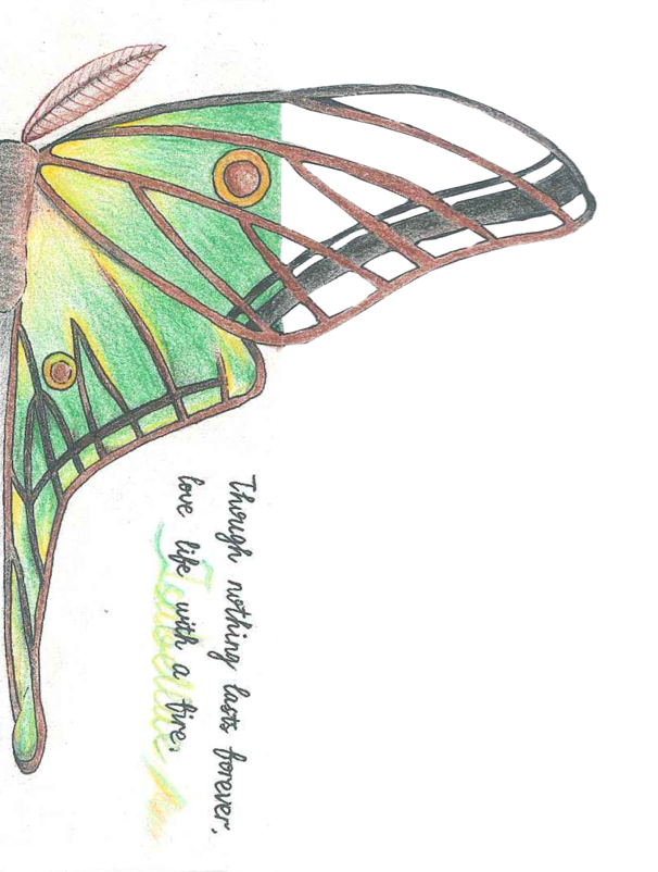 我们都知道,飞蛾具有趋光性,成语‘飞蛾扑火’说的也正是如此;然而即便她的生命仅犹昙花一现,她依旧在以世间最美的样貌,不畏火光,向光而舞,向死而生。飞蛾尚且如此,人又何尝不是。生命短暂,生死无常,丰满地活好每一天,且行且珍惜,这便是Though nothing lasts forever, love life with a fire.这句话想要传达的意思。画面中右半部分的翅膀做了镂空处理,与左半部分鲜亮的绿色形成对比,则是希望借以表现生命可以脆弱但不可以混沌模糊的内涵。