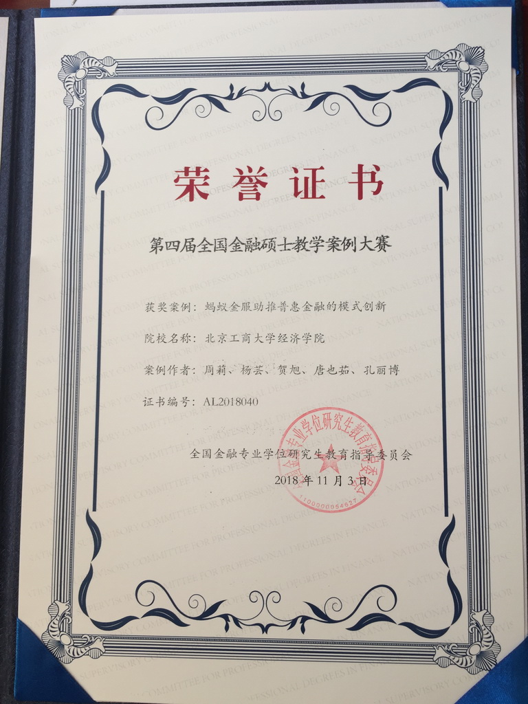 2018年11月3日,由全国金融专业学位研究生教育指导委员会举办的第四届全国金融专业学位教学案例大赛评选结果揭晓,公司金融系周莉教授指导的作品《蚂蚁金服助推普惠金融的模式创新》成功入选第四届全国金融硕士教学案例大赛优秀案例。