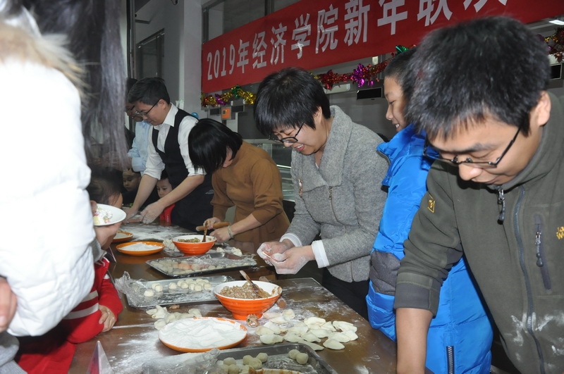 最后,晚会进入最后一项——包饺子大赛。平日里的科研教学达人也都显示了身手,擀面杖在手中上下滚动,饺子皮在其间左右翻飞,个个饺子如羊脂白玉,整齐落入盘中。老师们的默契配合,协力上阵,将联欢会画上圆满句号。