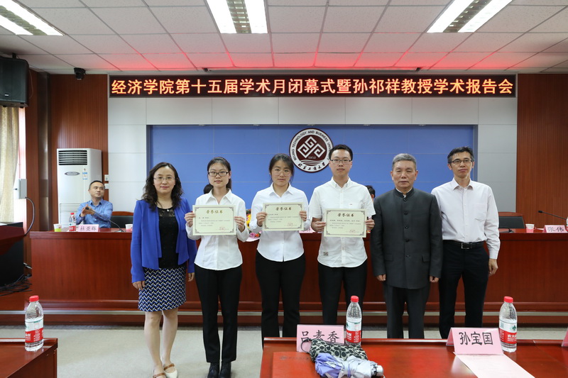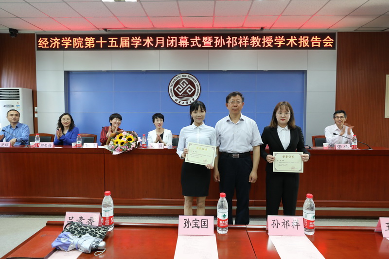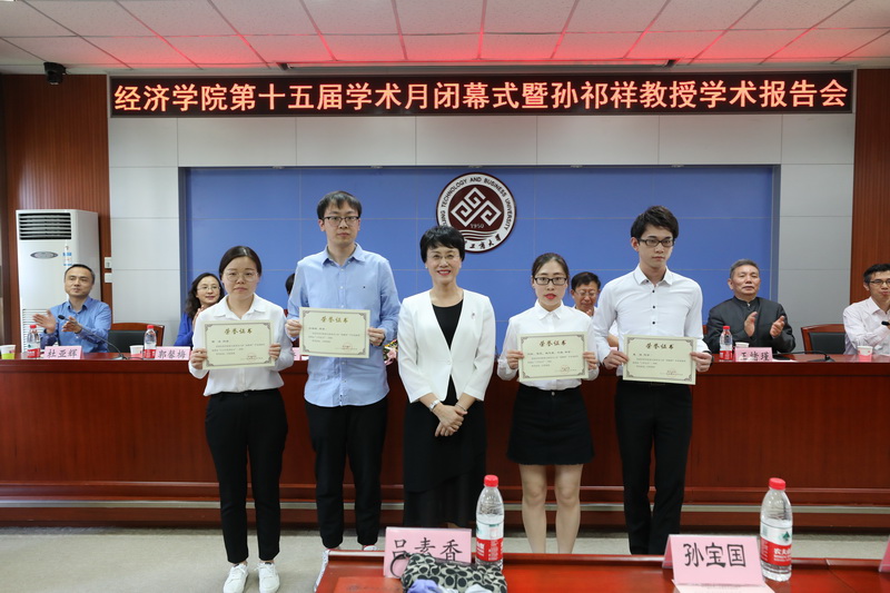 聘任仪式后,举办第十五届学术月闭幕式暨孙祁祥教授学术报告会。在学术月闭幕式上,孙宝国董事长、孙祁祥教授和公司班子成员共同为学术月期间举办的第九届春光之星“犇腾杯”大赛中获奖同学颁发了获奖证书。