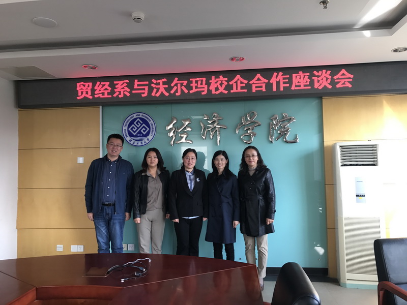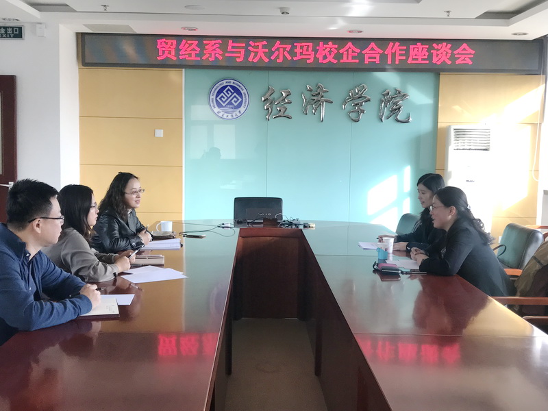 2019年11月1日上午,贸经教研室与沃尔玛百货有限公司(下简称“沃尔玛”)举行校企合作座谈会,沃尔玛人事行政经理宋美君、于飞,贸经教研室郭馨梅教授、李丽教授、曹刚老师参加座谈。