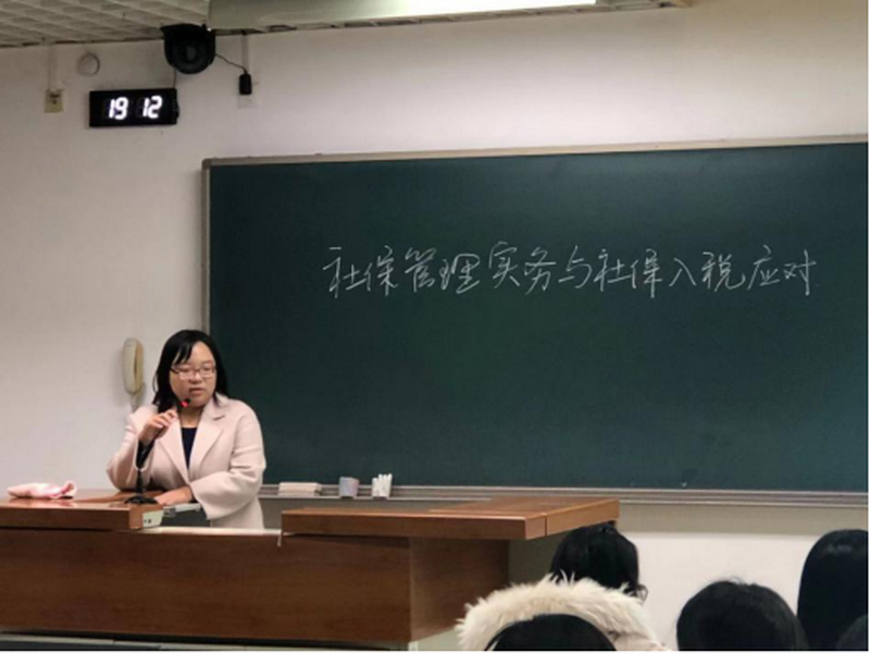 2019年11月20日晚,保险系17级全体员工在文二311聆听了社会保障学实践讲座。特别邀请校外专家——北京某大型民营建工企业薪酬经理苑媛为同学们讲解了社会管理实务与社保入税应对方面的内容,会议由王雯老师主持,宁威副经理参会。