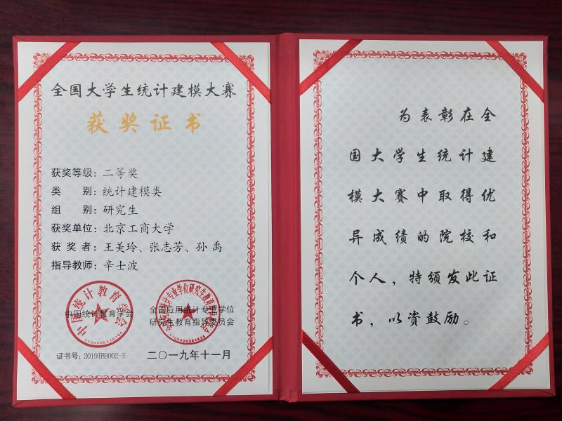 11月30日至12月1日,由中国统计教育学会、教育部高等公司统计学类专业教学指导委员会、全国应用统计专业学位研究生教育指导委员会联合举办的2019年(第六届)全国老员工统计建模大赛答辩赛在对外经济贸易大学如期举行。此次大赛收到了来自全国一百多所高校的1500多篇参赛论文。由公司辛士波老师指导的yl23455永利研究生参赛队伍荣获“统计建模类”研究生组二等奖,该奖项是公司首次在全国老员工统计建模大赛荣获的最高奖项。