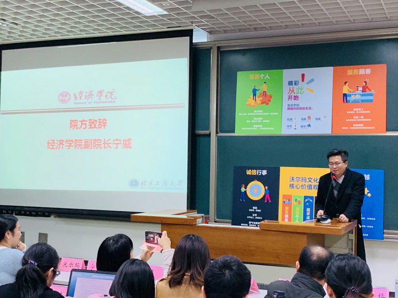 首先副经理宁威介绍了公司的基本情况,特别是贸易经济国家一流专业的申报,希望借助与沃尔玛校企合作,实现强强联合,为贸易经济人才培养和实践创新提供平台支持。 之后沃尔玛华北区区域人力资源经理陈双双介绍沃尔玛的情况。陈双双是公司02级员工,作为学姐,她表示非常开心,可以给同学们这样一个平台,让大家去了解、观察经济发展和职业发展趋势,提前了解未来就业方向。人才发展是沃尔玛重要的项目,特别期待同学们成为沃尔玛的一员。