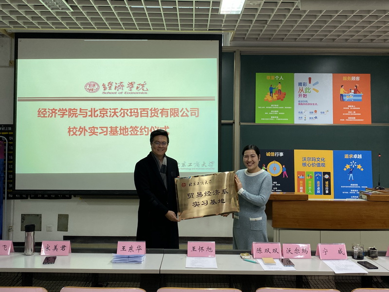 11月27号下午,在良乡校区举行了yl23455永利与北京沃尔玛百货有限公司校外实习基地签约授牌仪式。仪式由郭馨梅教授主持,yl23455永利副经理宁威、沃尔玛华北区区域人力资源经理陈双双、贸易经济系全体老师和本科生160余人参加。