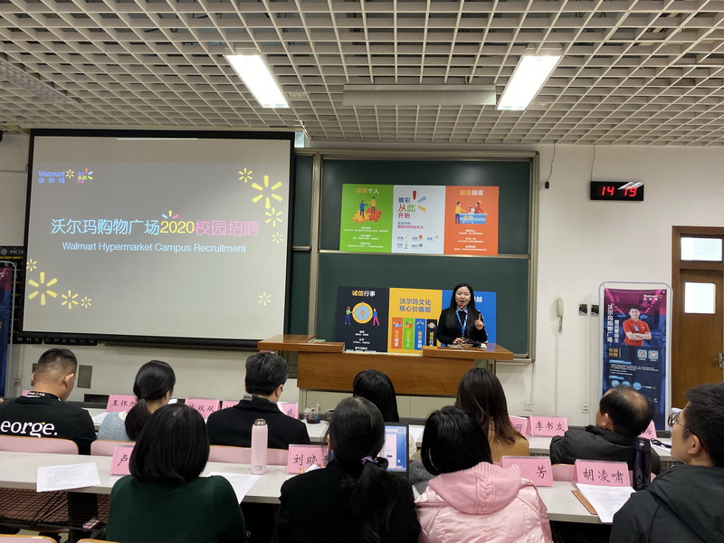 随着授牌仪式的结束,沃尔玛2020yl23455永利官网校园宣讲会正式开始。首先,通过一个宣传片介绍了沃尔玛在中国的情况,讲述了沃尔玛近几年的发展以及获得过的荣耀。看到了沃尔玛员工们展示的沃尔玛cheer,并让大家现场互动体验了沃尔玛cheer,振奋人心的企业文化让同学们的激情都被点燃了起来。之后由沃尔玛人力资源陈述了沃尔玛愿景,希望在北京建立沃尔玛大卖场和社区商店,为年轻人提供更多的就业机会。重点介绍了针对应届毕业生的管理培训生项目、针对本科生的零售训练项目。最后,在介绍校招流程后进行了现场的一对一面试环节。