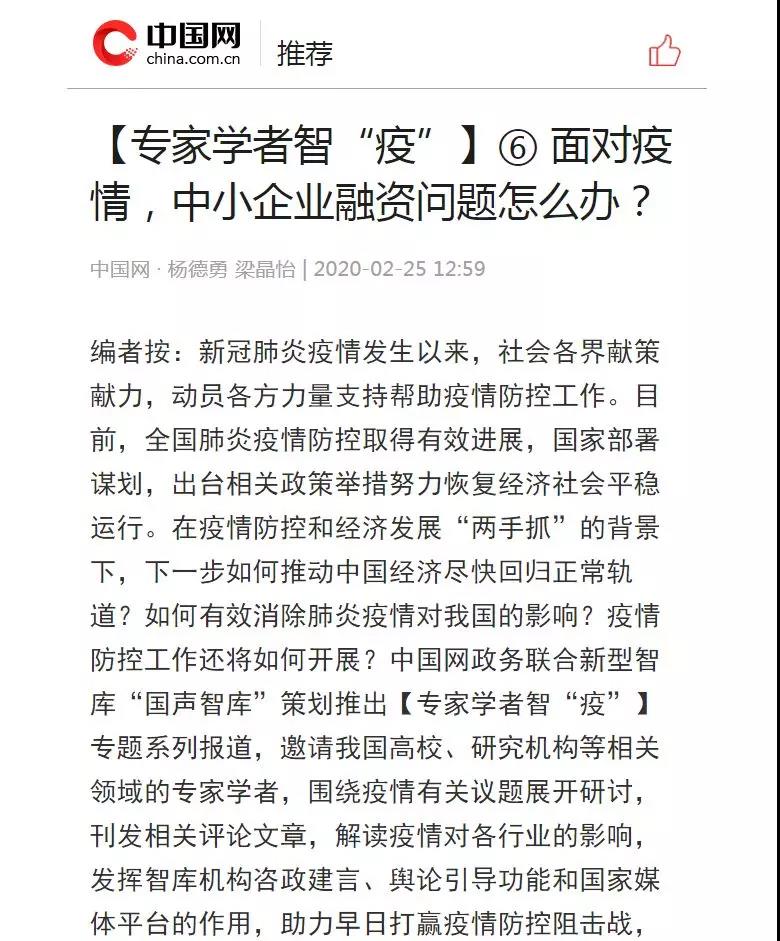 《疫情之下如何为中小企业解决融资困难问题》一文还被“国声智库”联合《中国网》策划的专家学者智“疫”专题活动采纳,该文章分析了疫情对中小企业融资产生的近期和远期影响,分别对中小企业、金融机构、金融市场和政府部门提出政策建议。文章强调金融机构在风险防范的前提下,尽快推出疫情背景下的新型金融产品,以解中小企业融资的燃眉之急;政府应适时推出新的财税政策和产业政策,以降低中小企业的负担,迅速恢复生产。文章一经刊发,即引起人民银行等监管部门、金融机构和企业界的重视,一些建议已经在国家近期出台的相关金融政策中得以体现。