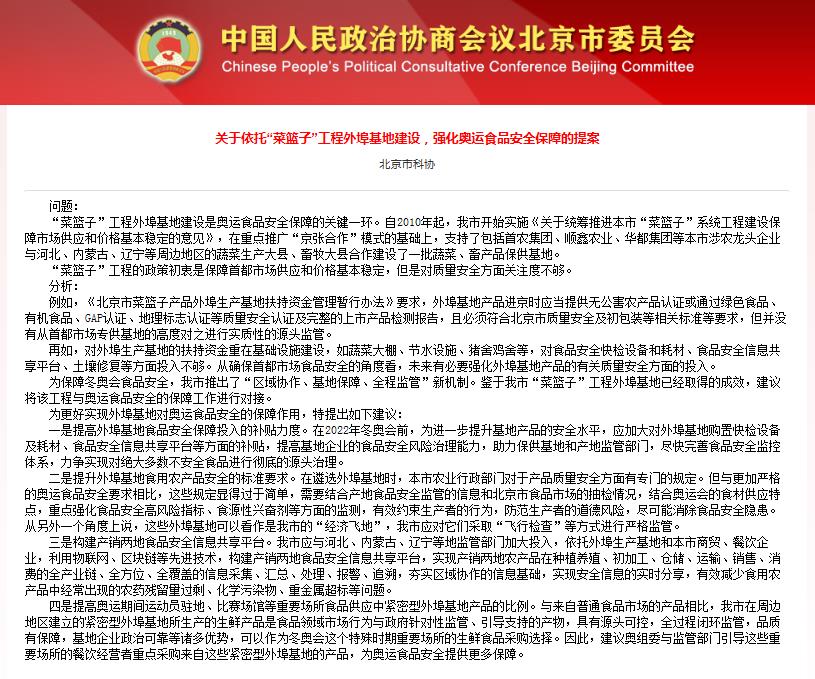 近日,公司周清杰教授团队的研究成果《依托“菜篮子”工程外埠基地建设,强化奥运食品安全保障》被北京市科协采纳,并列为中国人民政治协商会议北京市委员会第十三届三次会议团体提案。