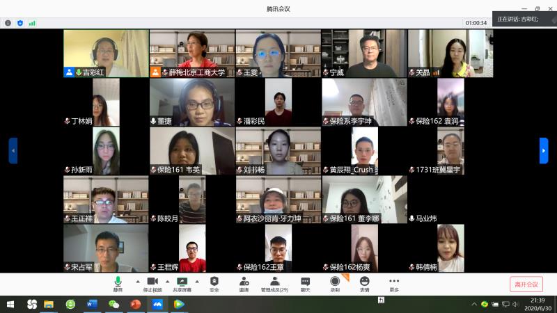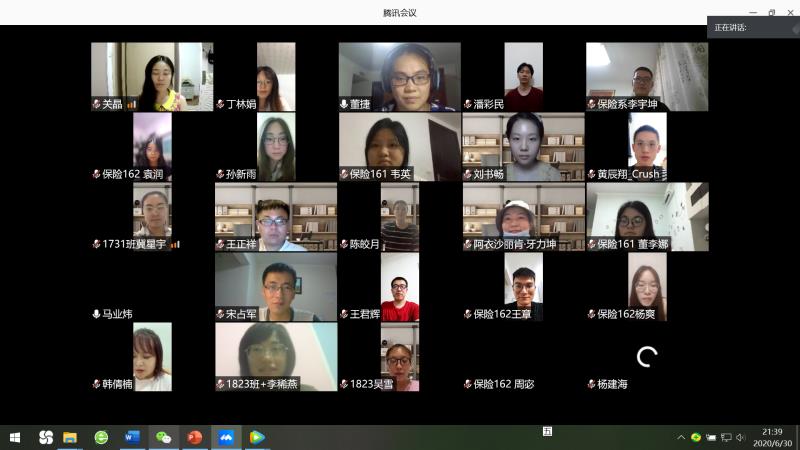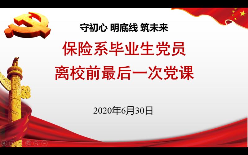 为进一步提高毕业生党员的思想觉悟,坚定理想信念,提高职业素养,保险党支部于2020年6月30日晚8点,在腾讯会议线上开展“守初心、明底线、筑未来”为主题的毕业生党员离校前最后一次党课。yl23455永利副经理宁威老师、保险党支部全体教师党员及本硕毕业班员工党员共二十余人参加本次党课,党课由党支部书记吉彩红老师主讲。