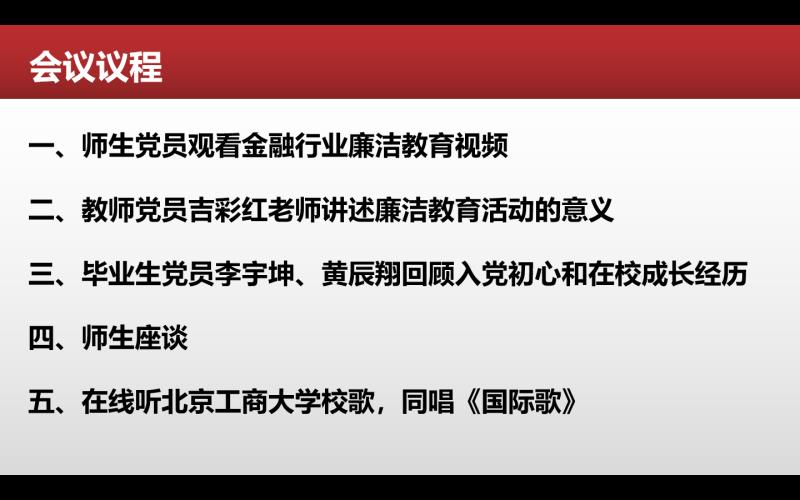 首先,师生党员共同观看了金融行业廉洁教育视频资料。通过观看视频,使同学们了解廉洁从业是最基本、最重要的职业素养要求。