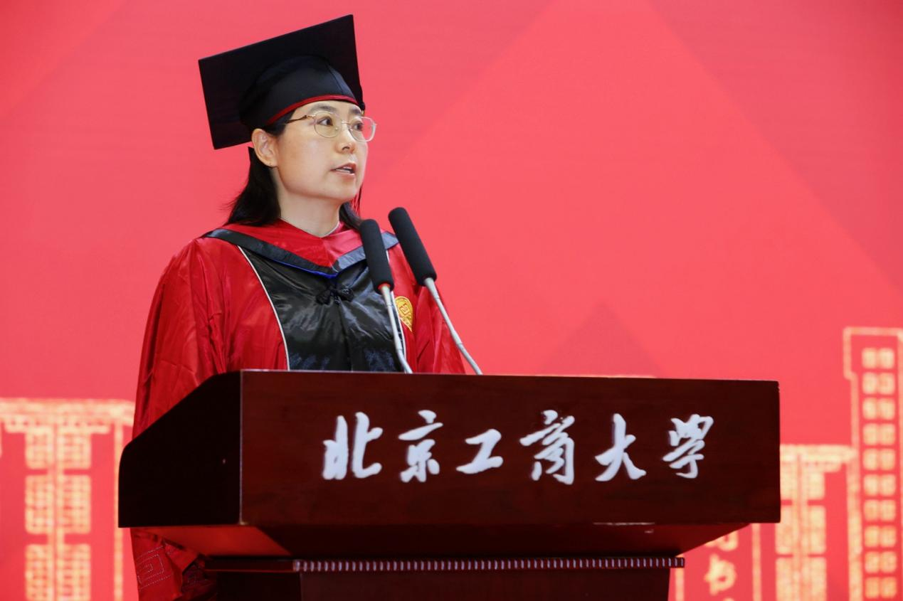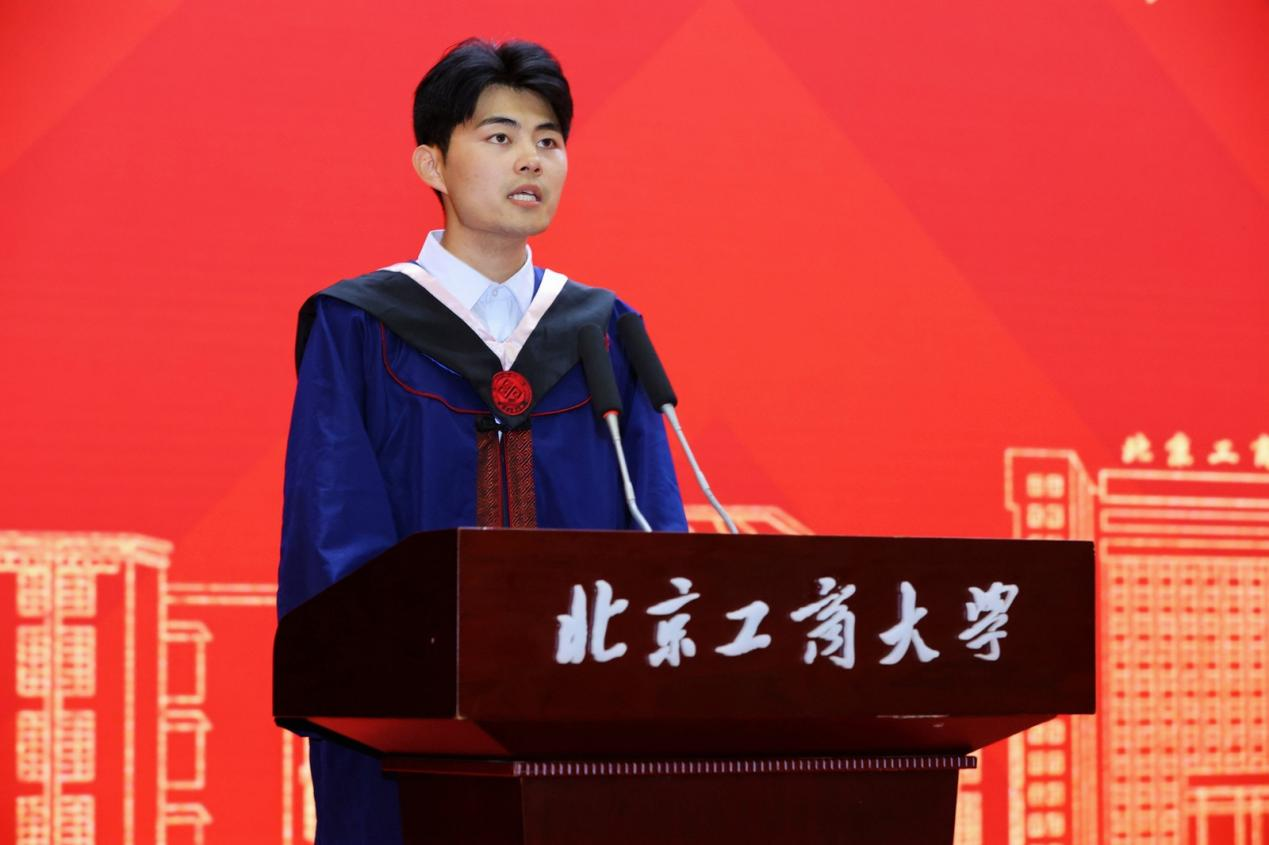 詹新宇经理代表公司致辞。他向各位毕业生圆满完成学业表示热烈祝贺,向为员工成长成才付出辛勤汗水的老师、家长、校外导师致以衷心谢意。詹经理表示,当前正处在百年未有的历史交汇点,民族复兴的宏伟蓝图与世界格局的深刻变革相互交织,同学们走出校门所面临的不仅是一个充满无限可能的广阔天地,同时也将承载着来自现实的重重考验,伴随着诸多外生冲击和不确定性。如何在不确定性中敏锐捕捉并把握发展机遇,在不确定性中保持理性冷静与战略坚定,显得至关重要。为此,他叮嘱同学们:以积极向上的心态,客观认识不确定性;以主动求变的心态,欣然接受不确定性;以终身学习的心态,坚定应对不确定性。詹经理希望同学们肩负起推动国家繁荣、民族复兴的历史重任,始终践行“求真、立德、勤奋、创新”的北工商校训,让青春在实现中华民族伟大复兴的征途中绽放绚丽光彩!
