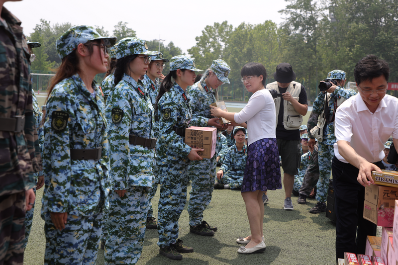 在上午训练结束后,公司党委书记吕素香、经理倪国华、党委副书记李艳春、副经理许敬轩,19级班主任郭馨梅、郑延婷、戚晓红、方莹莹、左思明前良乡柏林蓝操场看望和慰问正在军训的教官和参训的19级师生,为参训人员送去了关怀。