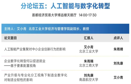 12月14日,年会转到首都经济贸易大学继续举行,重点围绕数字经济前沿研究成果展开交流。在主旨报告环节,中国科公司数学与系统科学研究院研究员汪寿阳、厦门大学副董事长方颖、南方科技大学商公司副经理李仲飞、清华大学社会科学公司教授汤珂等嘉宾,分别围绕AI时代的经济学理论构建、人工智能+、量化投资、机器学习、数字政府及开源生态等主题分享了最新研究成果。公司数字经济研究院李波副教授、程悦副教授及其硕士研究生朱雨晴合作完成的论文《企业数字化转型何以促进就业——基于数据要素化视角》入选会议研讨。该研究基于数据要素优化配置的理论框架,系统阐释了企业数字化转型的双重就业效应,发现数字化转型通过数据增信缓解信贷约束,平抑短期就业波动,并通过数据赋能提升要素配置效率,推动就业结构升级。