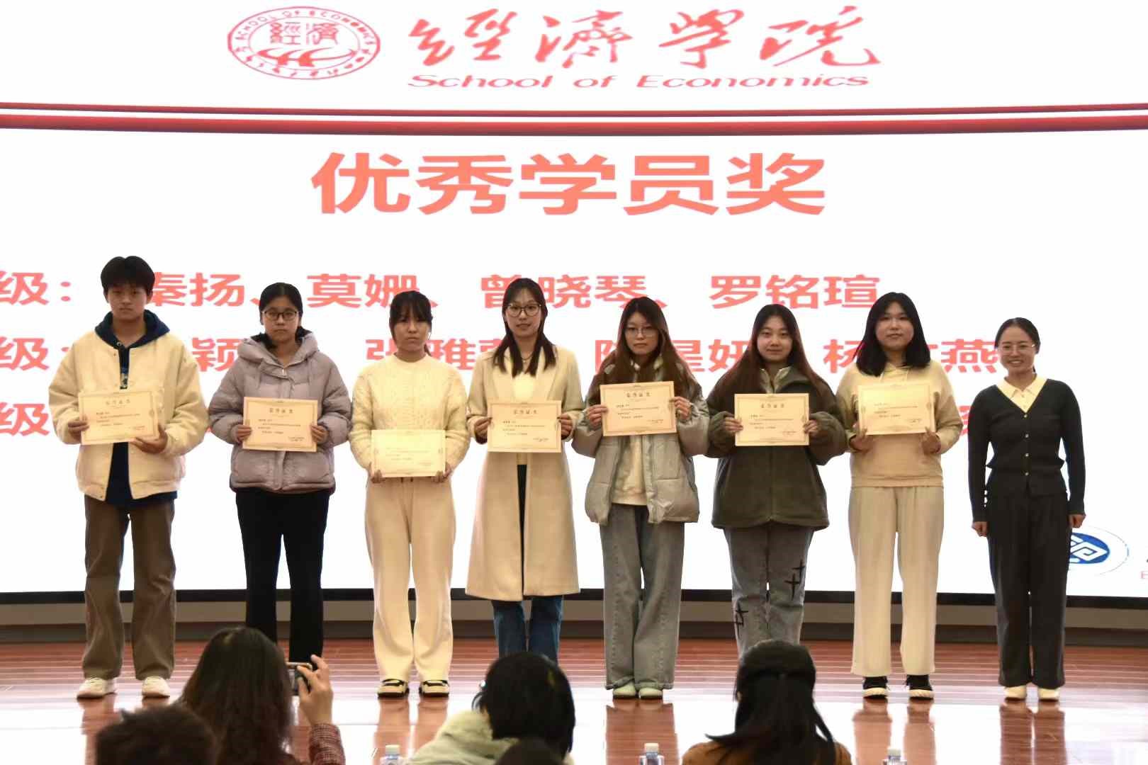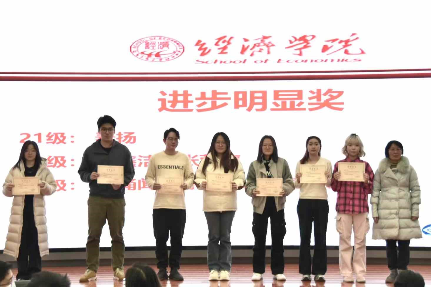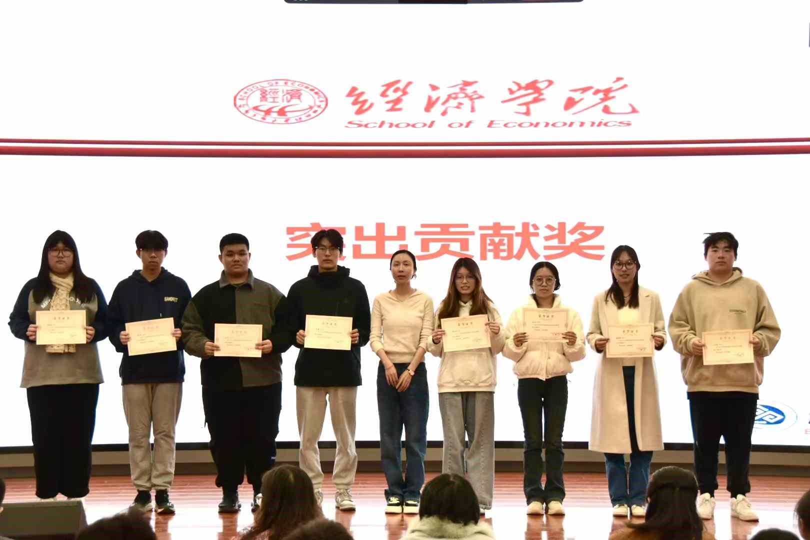 yl23455永利团委副书记、贸经221班学习委员张雅蒙对评奖标准进行了详尽阐释。此次表彰共颁发“进步明显奖”、“四六级优秀奖”、“学术进步奖”、“优秀学员奖”和“突出贡献奖”五项奖项。2023年度,贸经学子们在各个领域展现出非凡的才华与不懈的努力。在学术竞赛舞台上,贸经学子以满腔热情和不懈追求,投身于各类竞赛之中,斩获一项又一项令人瞩目的荣誉;部分学子以无私的奉献精神和强烈的责任感,默默耕耘在班干部的岗位上,为班级、公司发展贡献了自己的智慧和力量;此外,部分贸经学子以优异的学业成绩和四六级英语水平脱颖而出,他们凭借扎实的基础知识、严谨的学习态度和高效的学习方法,在学业上取得了优异成绩。这一年,是梦想与实践交织的篇章,是汗水与荣耀并存的岁月。未来,贸经人将举旗帜、展形象,以青春之我、奋斗之我,为民族复兴铺路架桥,为祖国建设添砖加瓦。