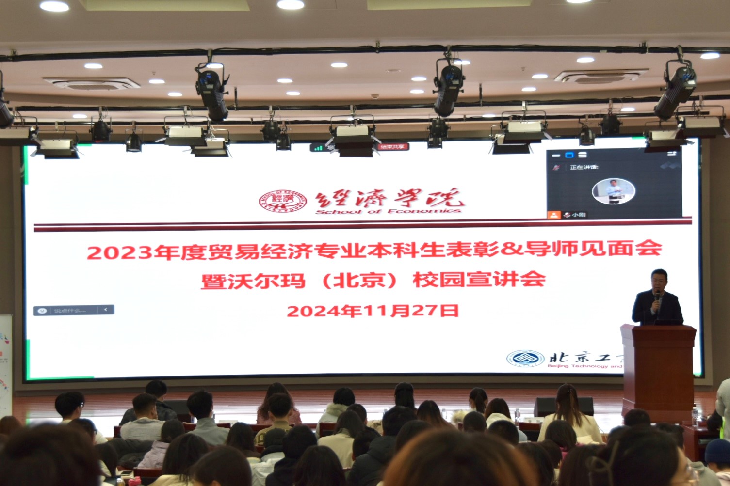 为增进贸经系员工对实习机会的了解,贸易经济系曹刚老师主持了2024年沃尔玛(北京)校园宣讲环节。曹刚老师向在场员工详细介绍了贸易经济专业与沃尔玛校企合作的历史,并对沃尔玛长期以来对本专业的支持表示感谢。他相信员工们在此次宣讲中一定能获得宝贵的知识与经验。