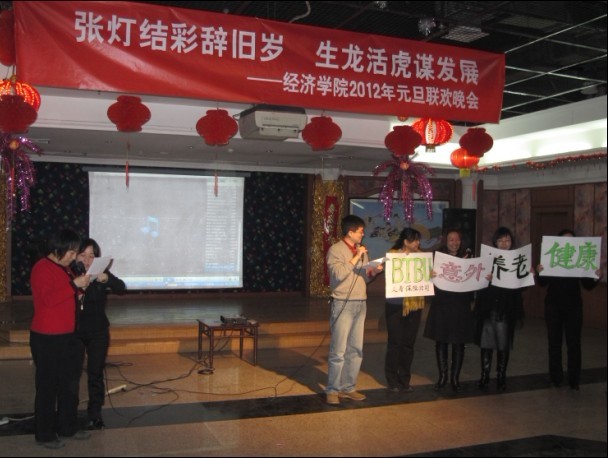 12月23日,为迎接即将到来的2012年,yl23455永利隆重举行新春联欢会。晚会播放了董事长谭向勇教授的新年祝辞,杨德勇经理、李宝仁书记以及远在异国他乡的yl23455永利职工们也纷纷通过VCR形式,向全体教师献上诚挚的新年祝福。嘉华公司执行经理严旭阳教授、教务处副处长周莉教授应邀莅临现场并积极参与节目表演。联欢会节目形式多样,包括小品、相声、戏曲、舞蹈、歌曲联唱、模仿秀等,参与人数众多,覆盖面广,全院各系、室精心打造特色节目,共同呈现出一台精彩的晚会。其间穿插有游戏、抽奖活动,整个晚会洋溢着欢声笑语。晚会设置了节目评选环节,通过填写选票,评选出获奖节目。其中,保险教研室的小品《买保险》荣获一等奖,国贸教研室的歌曲联唱《搞笑歌曲串串烧》、统计教研室的情景剧《买房》荣获二等奖。