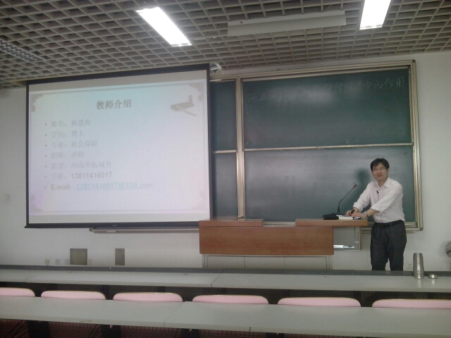 保险学社主办的双周论坛系列活动于2014年4月2日下午在文二403教室举行。本次活动特别邀请到商业保险学杨建海博士担任活动主讲。讲座的主题是《商业保险在社会保障体系中的作用》,参加讲座的有对保险专业感兴趣的各年级员工。