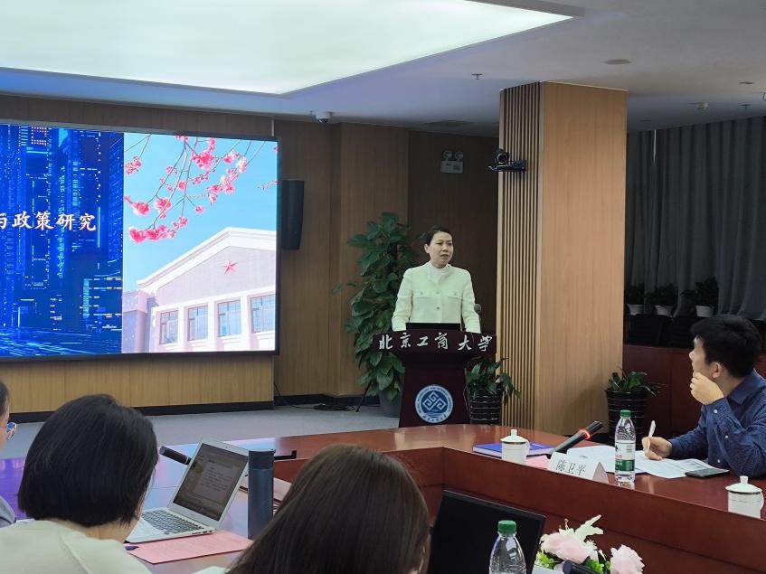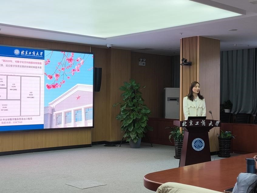 开题汇报环节,年度重点项目“北京市以高水平开放推动数字服务贸易高质量发展的举措研究”负责人邸玉娜教授围绕国内外主要城市数字服务贸易发展水平的评估、以高水平开放促进数字服务贸易发展的政策经验、北京市促进数字服务贸易高质量发展的对外开放举措等方面进行了系统阐述。